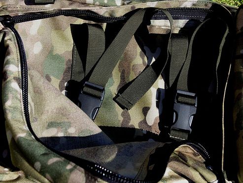 - Large Slash Pocket with HD Single Pull Zipper with Para Cord Pull. Interior of Pocket features two (2) HD Webbing Hold-Downs with HD Fastex Buckles to secure supplies, gear, ect.