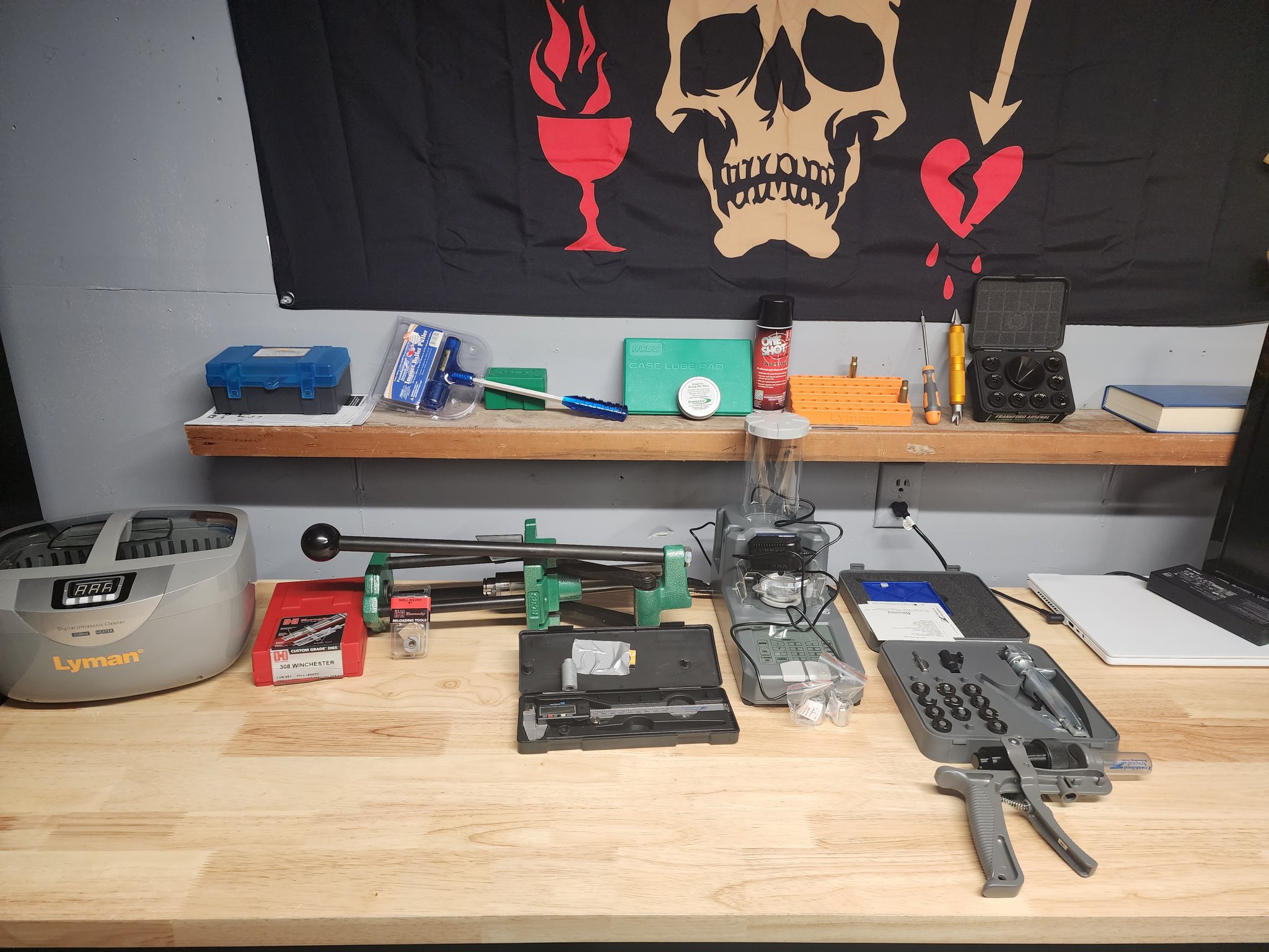 I haven't reloaded any ammo yet and want to get going. The instructions for my Dies say I need to take them apart and clean the anti rust stuff before first use. I Do not have a case trimmer yet however the Frankfort one to use with my drill will be here soon. I mounted my press onto my reloading table since I took the picture of equipment. Also I am looking for a stone slab to put under my powder dispenser with some cork pads to help with vibration.