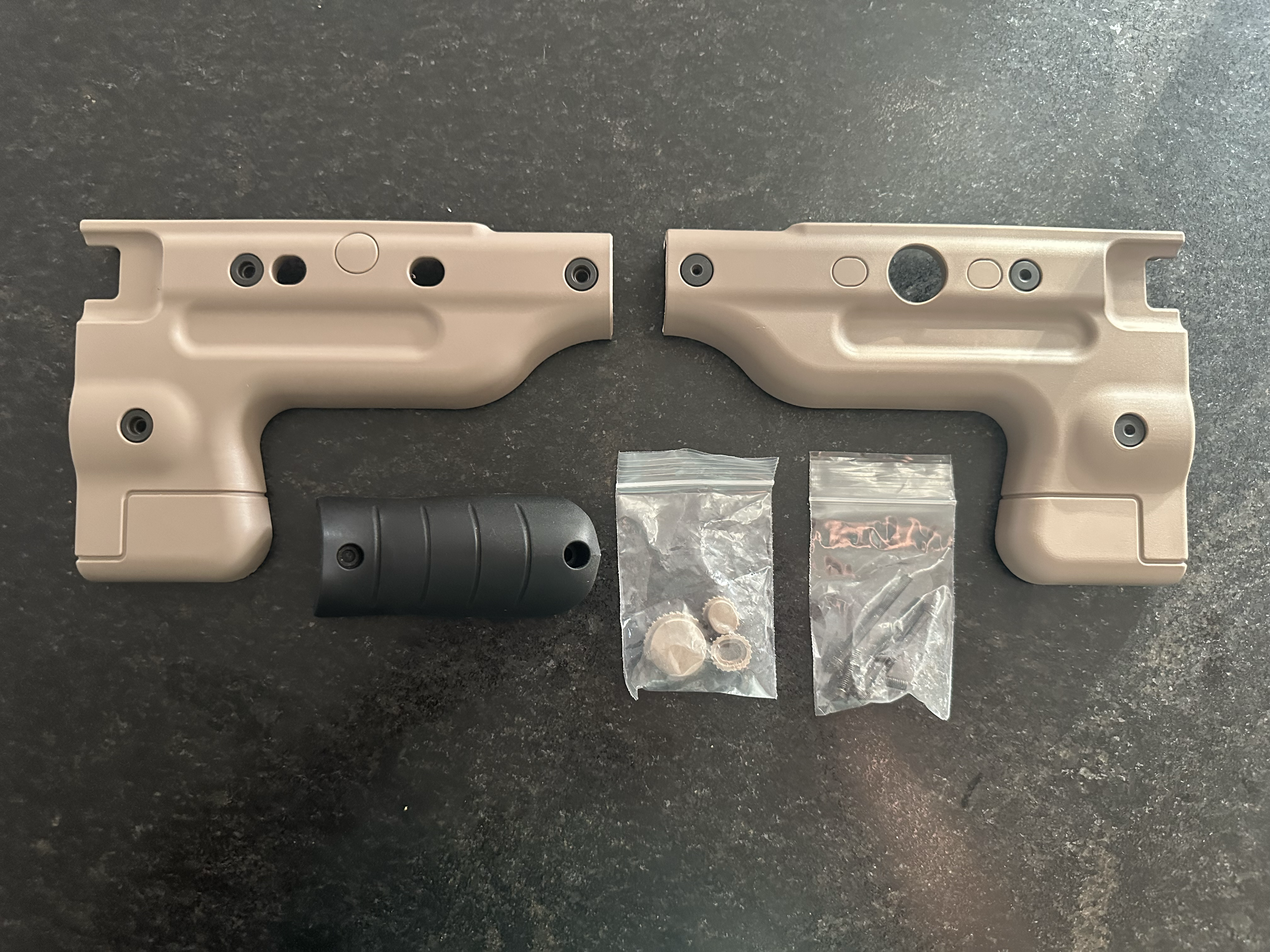 It has a brand new AI thumbhole stock in pale brown that I literally just installed today. It also includes the standard factory grip. The folding mechanism works like a bank vault - zero slop.
