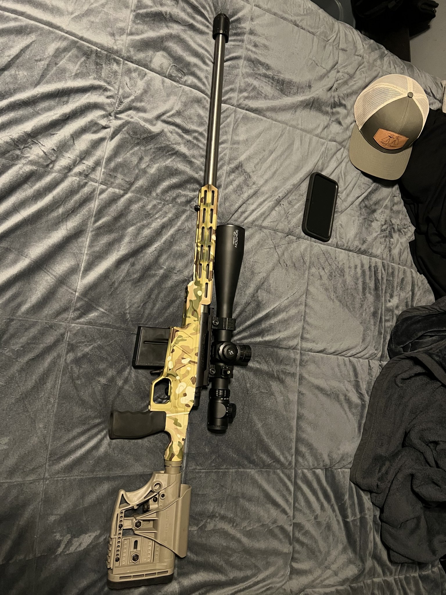 -24” barrel, threaded, brake made, and cerakoted by hunts long range in Summersville