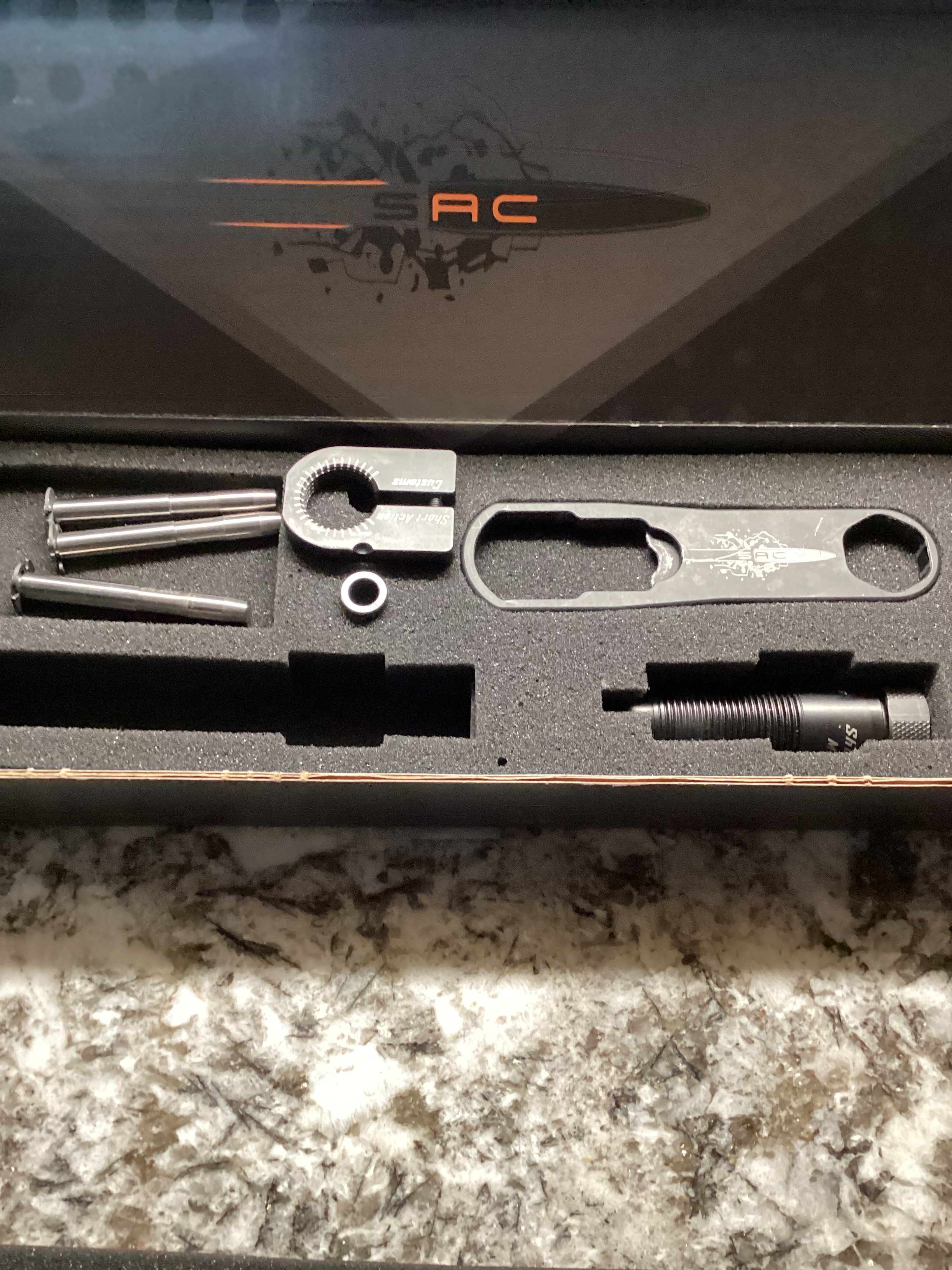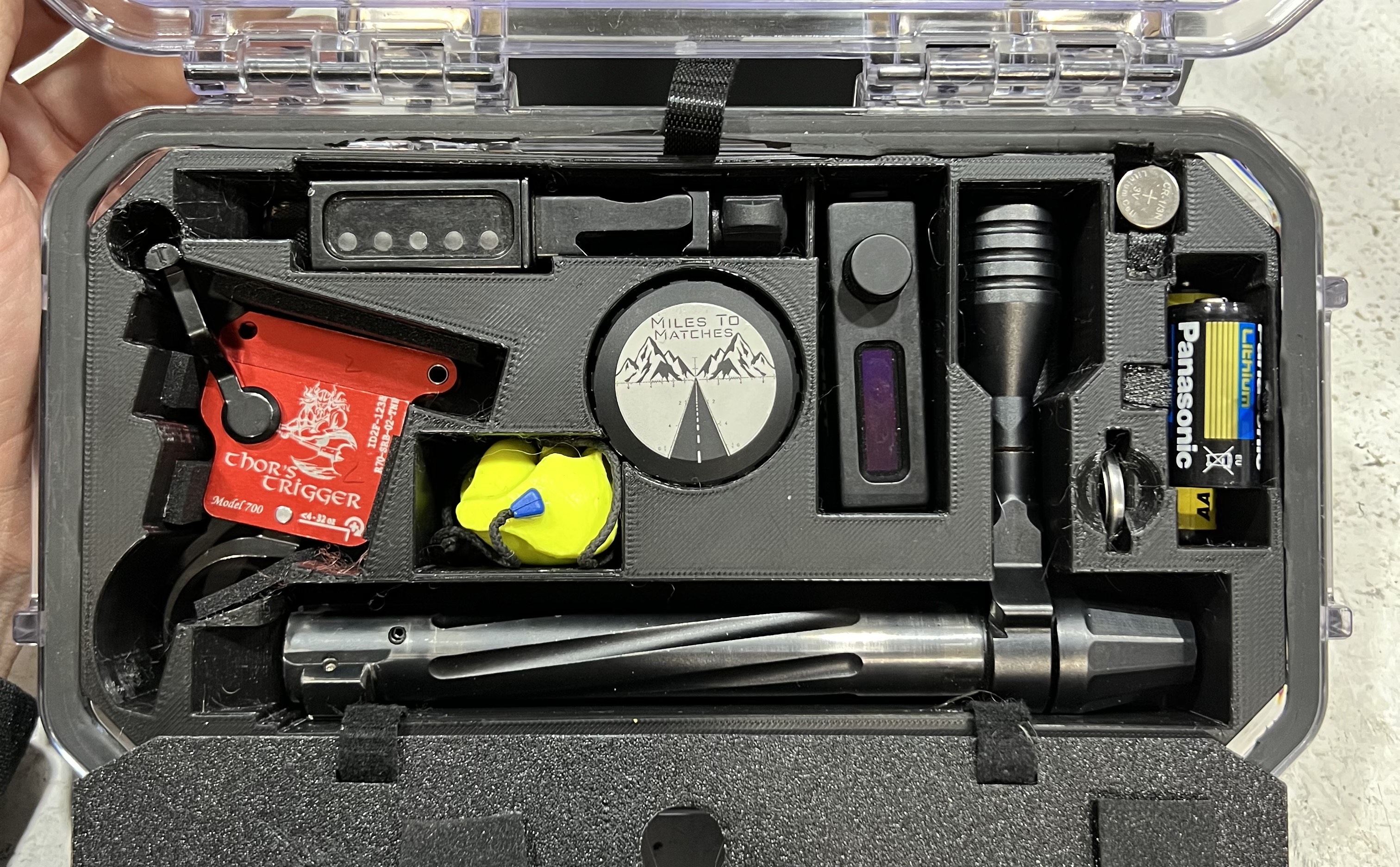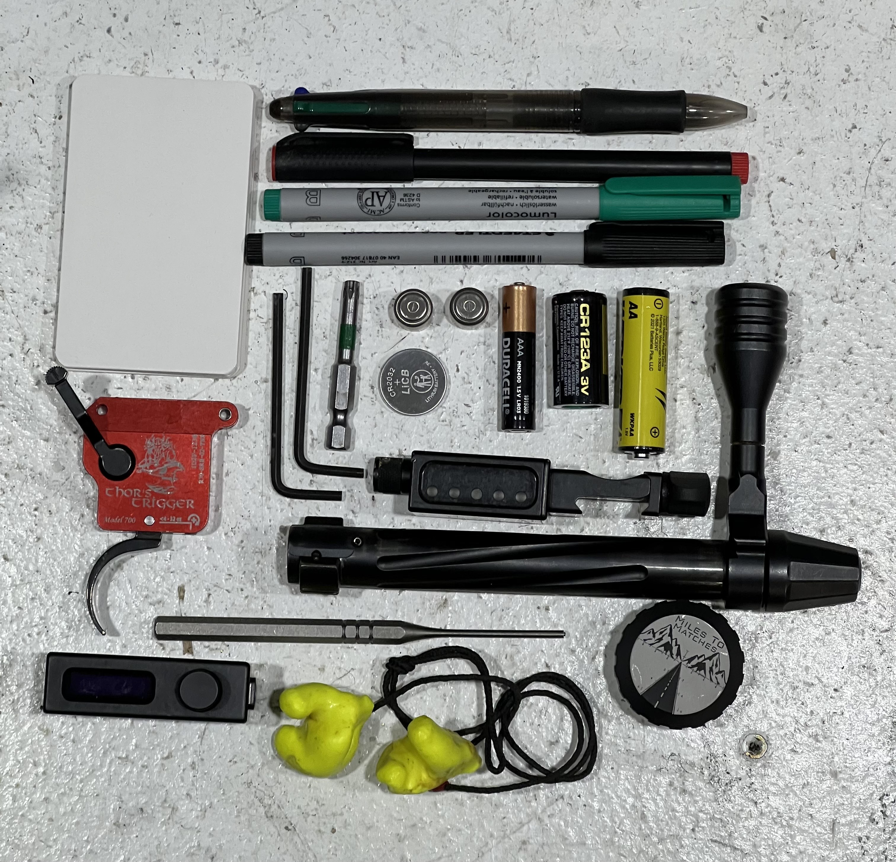 Trigger flat and curved, Bolt, Ear Pro, Turret, Send it( old style fits by removing cover), Crush it , punch for the trigger, 25 dope cards ( small and large version) 4 pens or markers, loose Allen’s and screws