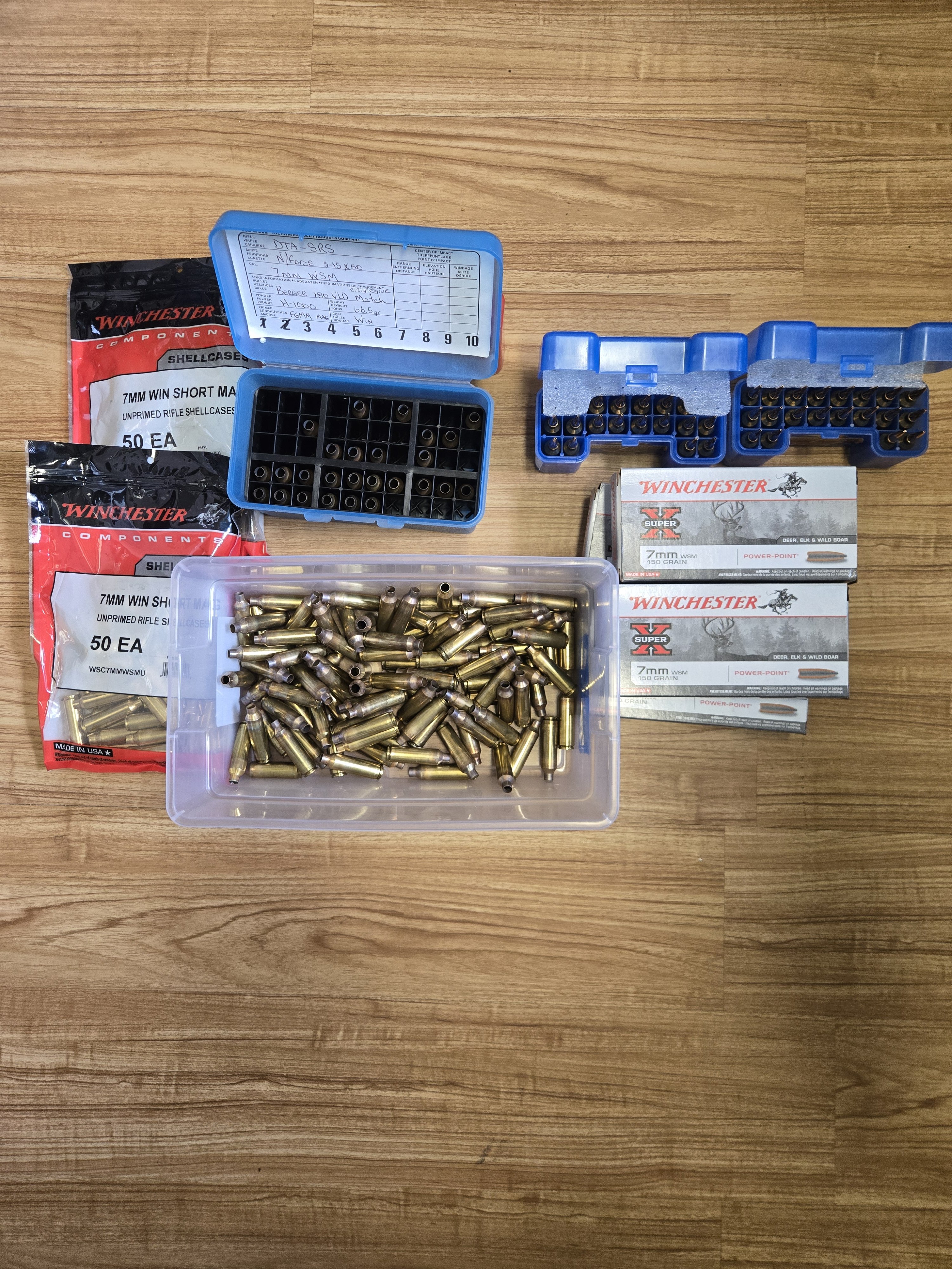 30" 7mm WSM Barrel w/ Surefire Muzzle Brake from SAC, 120 Rds Winchester 7mm WSM Factory Ammo, 100 pieces NEW 7mm WSM brass and 123 pieces USED brass. - $1200