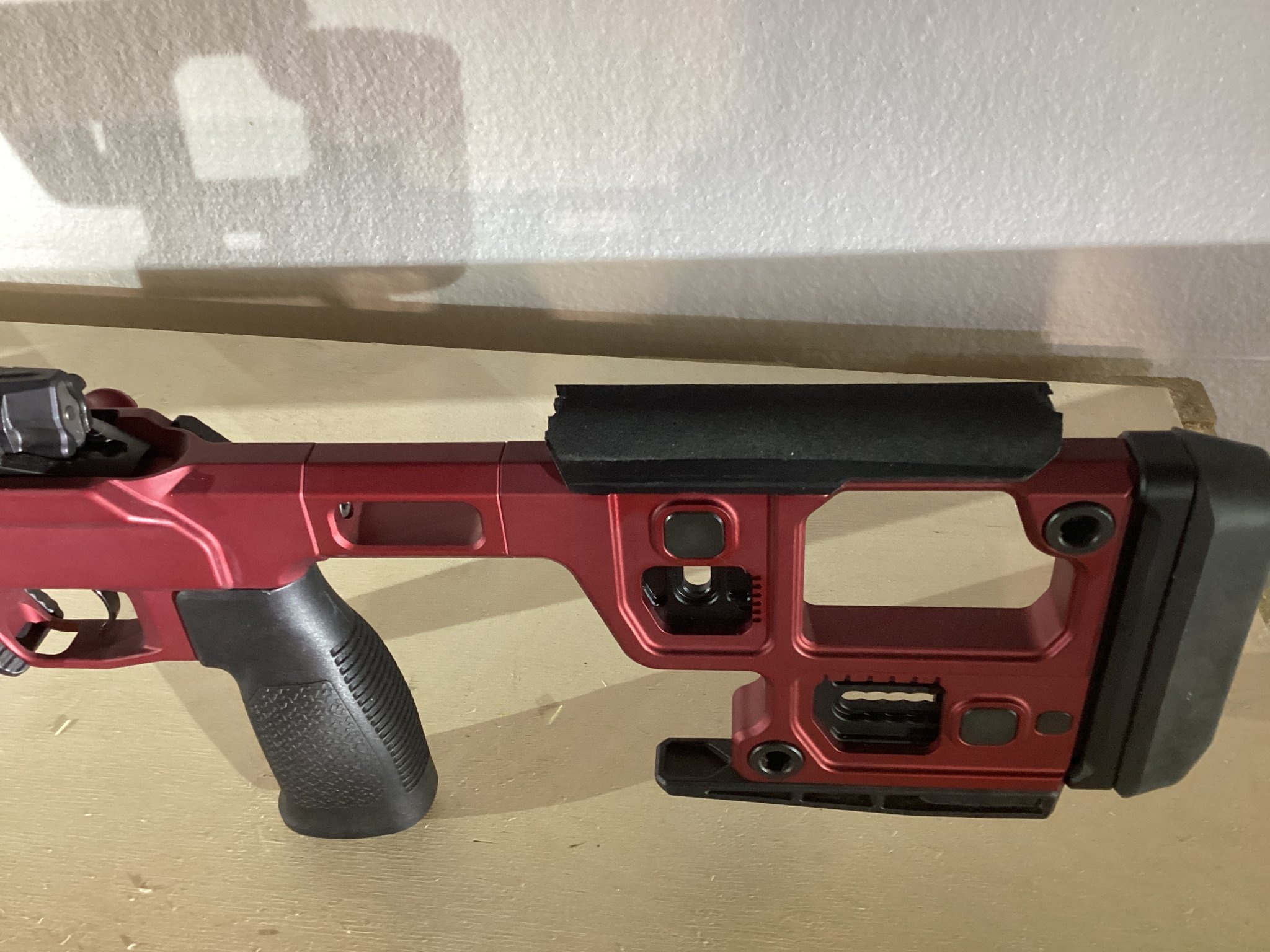 -Aero solus chassis-blem bordeaux red, has some sections with slightly less matte anodizing. Machined for trigger hanger pocket. 3d printed cheek rest with foam cover, shorter to allow easy bolt release, original included. Used in comps-various small scratches and marks on ARCA