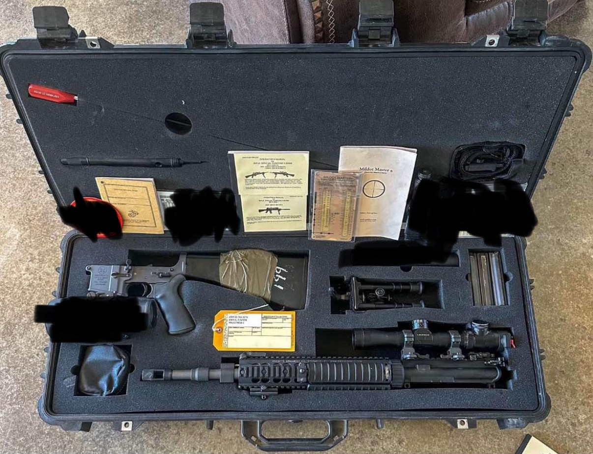 Deployment case is issued mk12 case, mk12 foam, OG Otis cleaning kit, Mk12 bore guide, Dewey Cleaning rod, 3 20rd mags, USMC gunbook, mil dot master book, mk12 mod 1 OP Manual. Original Eagle industries TAS sling. Suppressor not included