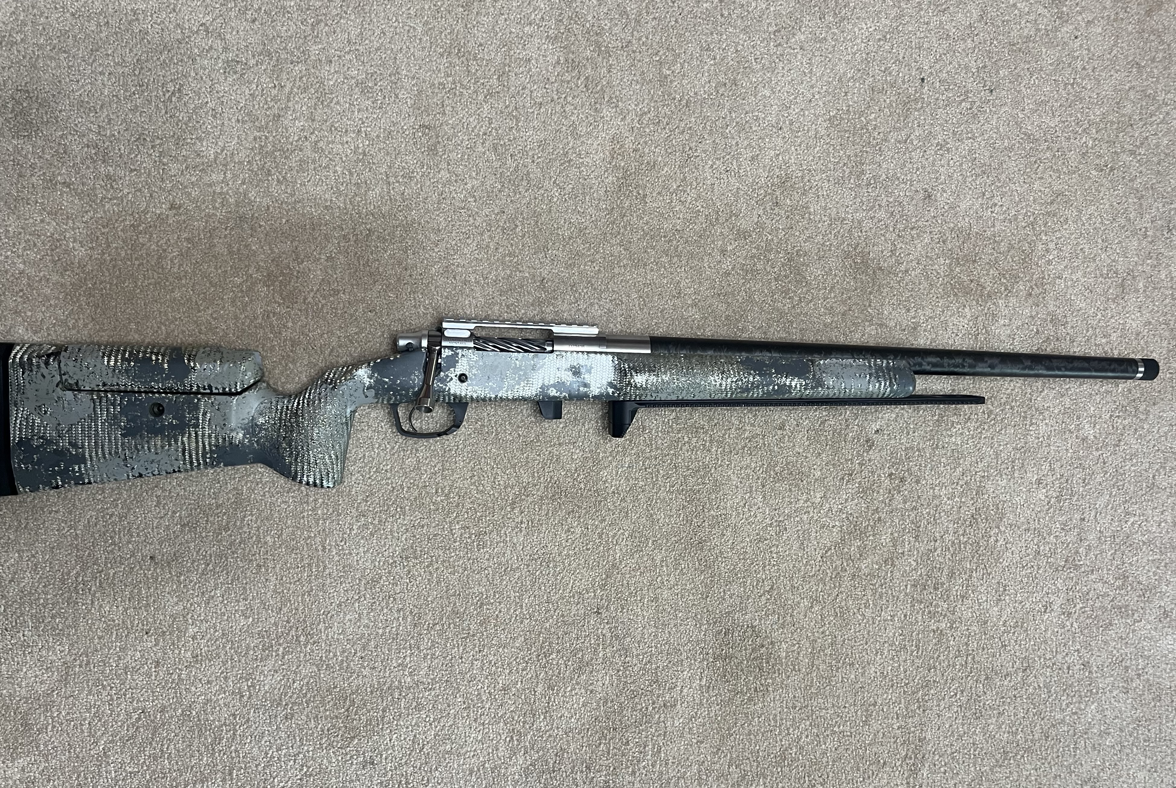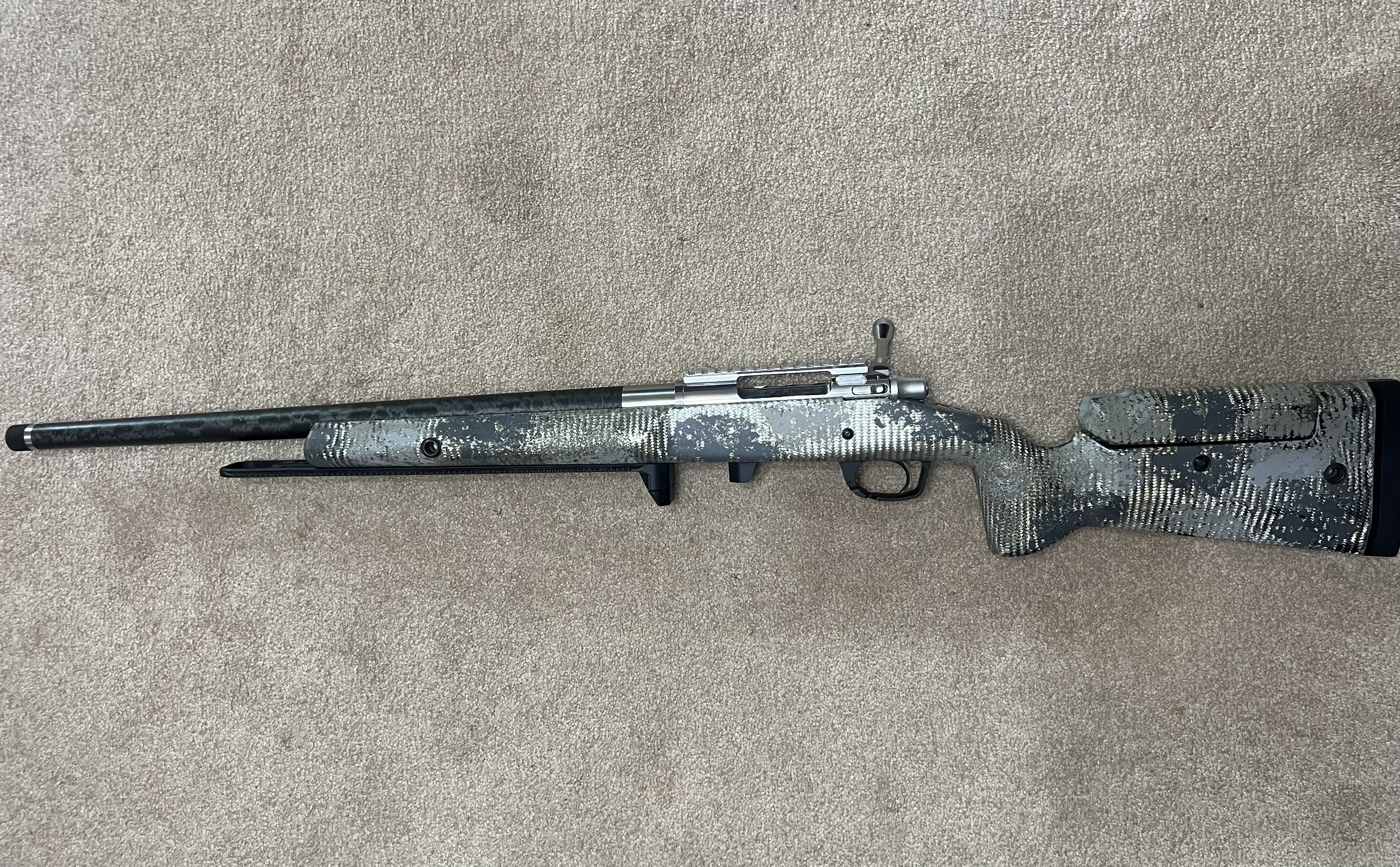 22 CREED built on a defiance classic short action, 22" carbon fiber carbon six barrel with a 7.7 twist rate and a 5/8-24 at the muzzle, Trigger Tech Trigger sitting in a Manners T2A with MCS-DBM gen 2 mini Chassis for in the discontinued Arctic molded in Elite Tac finish / Elite Hunter shell. Has a 14" 419 Arcalock rail with barricade stop, two flush cups on the left side (front and rear) with 1" rear pad. 5 shot groups average .4-.5MOA with Factory Hornday Ammo.