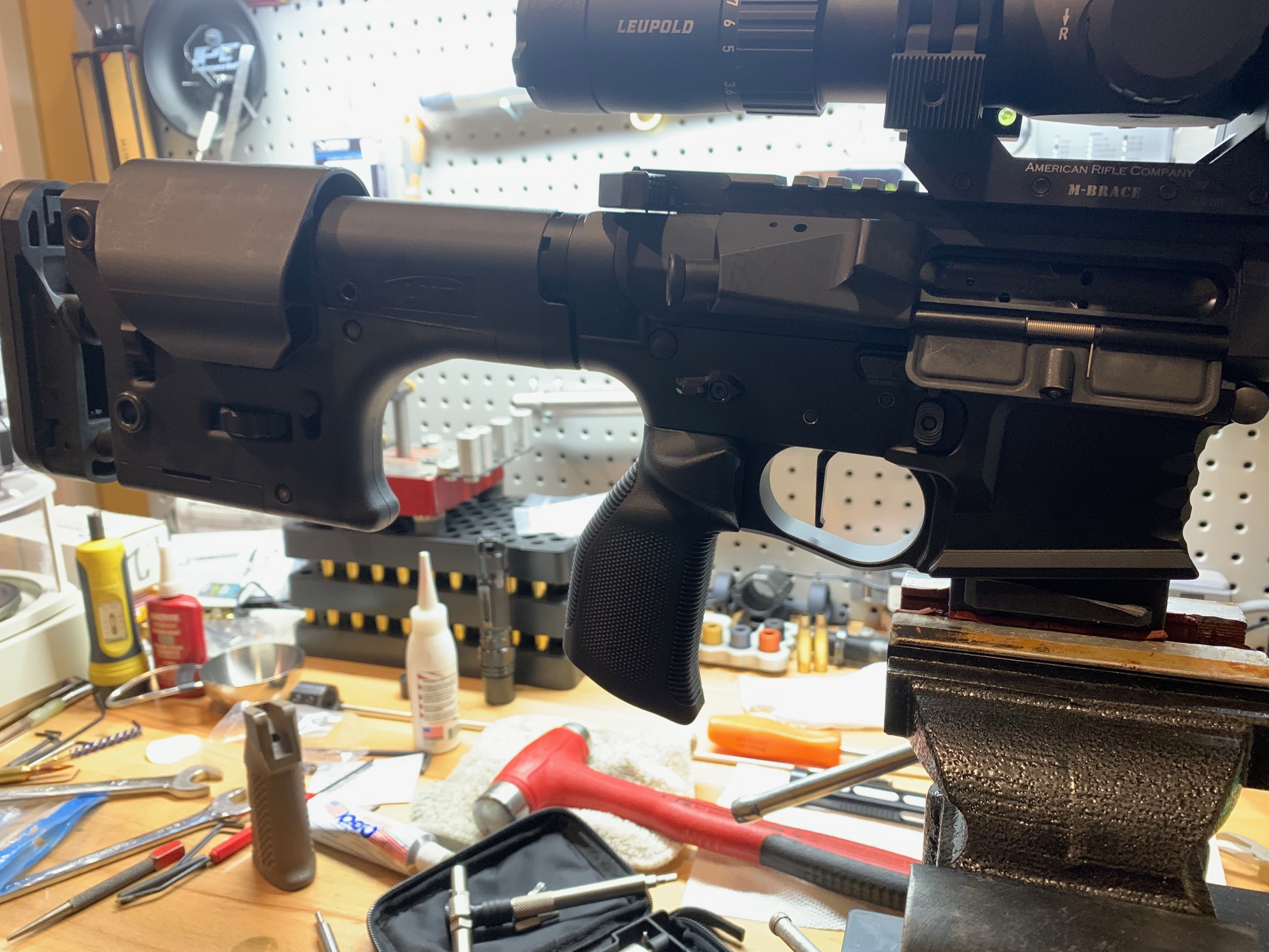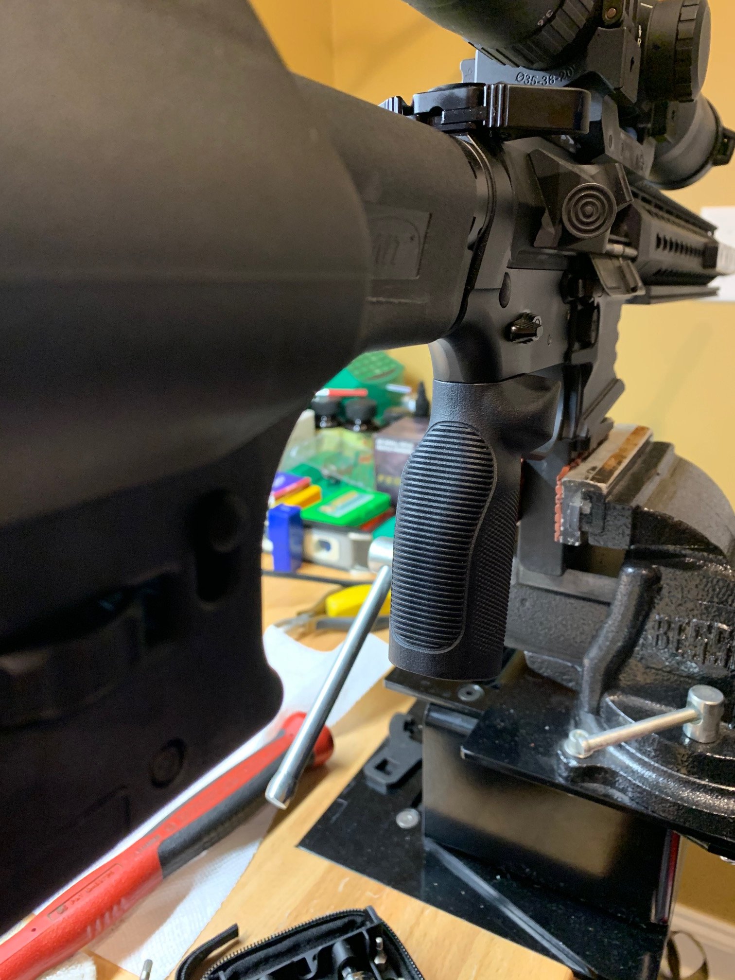 I have tried a bunch of grips. Ended up with the mdt elite grip. It’s adjustable in grip angle as well as forward and back. https://mdttac.com/mdt-vertical-grip-elite/