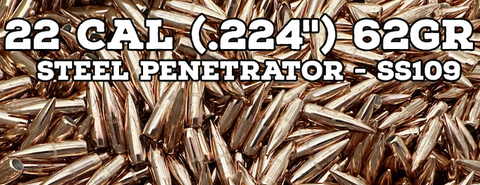 Developed for the international market, these incredibly unique .224" flat base protected point bullets expand at supersonic velocities. Capable of being loaded to standard length and cycling in magazine fed 223 Rem / 5.56 NATO semi-automatic rifles, these bullets hit hard and are truly unique. Made with precision in the USA by Mead. 1:7 or faster barrel twist required.