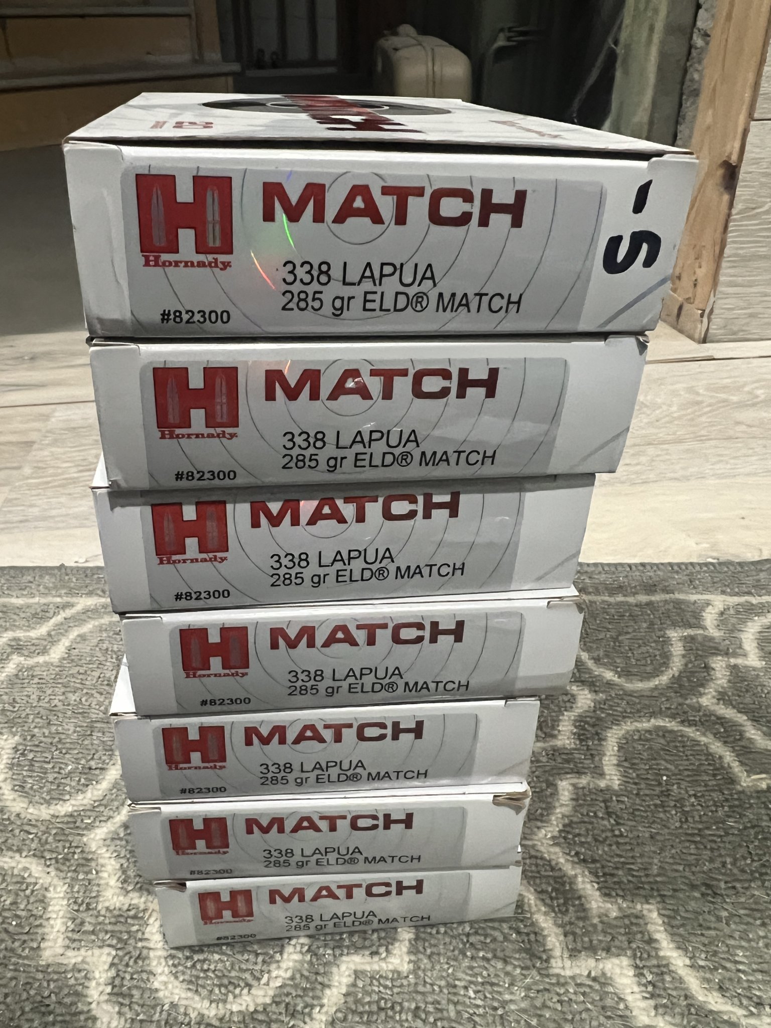 135rds of Hornday 338 lapua match ammo. All the same lot #. The 5 spent in one box are included in there.
