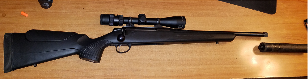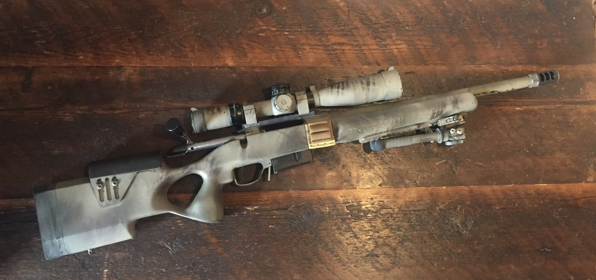 Tikka T3 .308 chopped 17.5' with a 3-12 LRHS. 2700fps with OSA factory 165gr. 11.7 lbs as pictured above. I can get it down to 10.3lbs if I drop it in my Manners T3, lose the bipod, brake, pic-rail and replace the Seekins rings with Talley lightweights. Makes for a very handy hunting setup. For range play the Manners T5 wins out