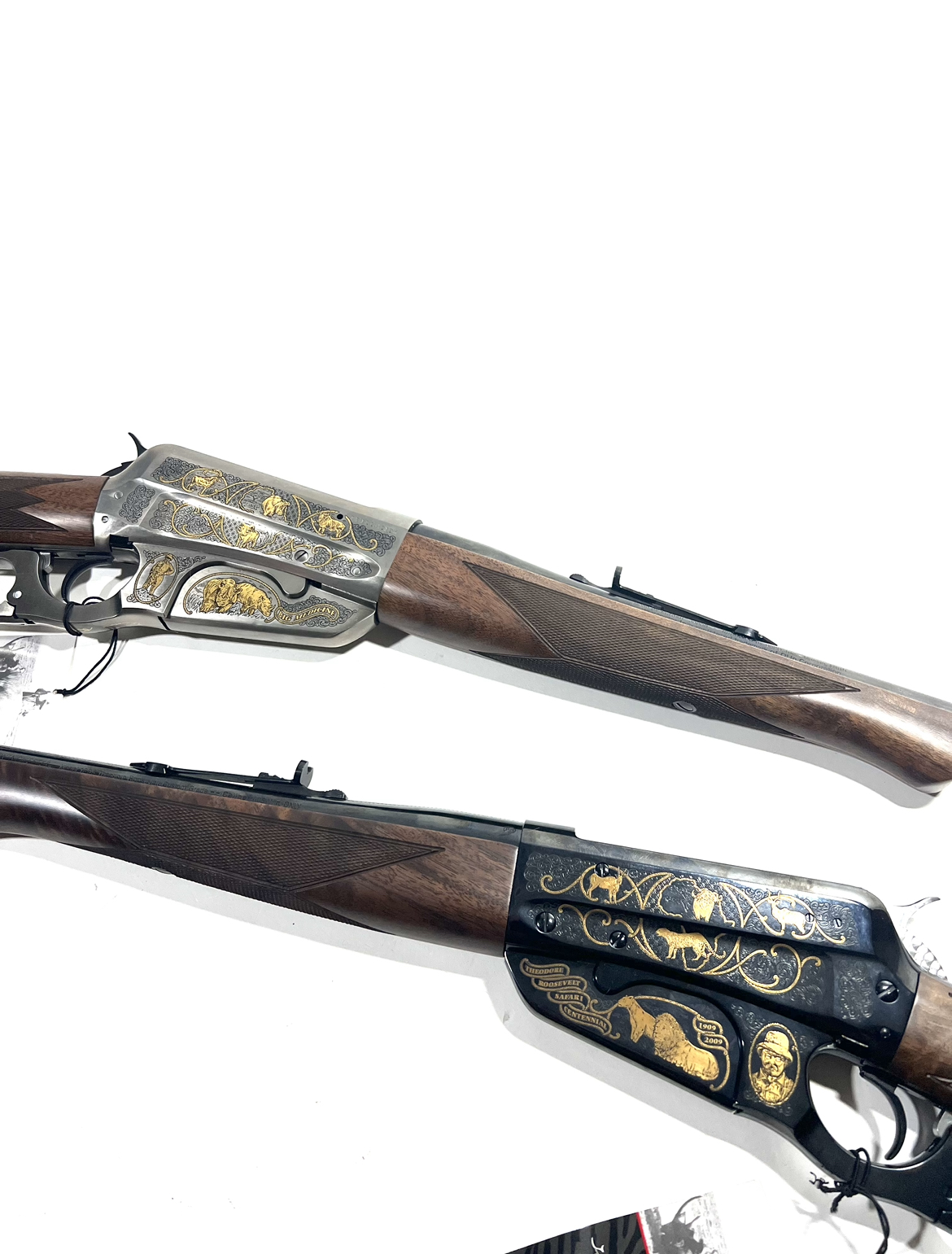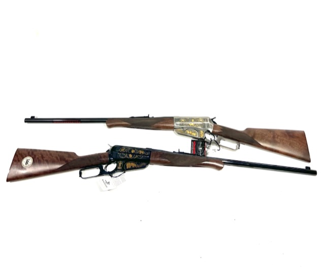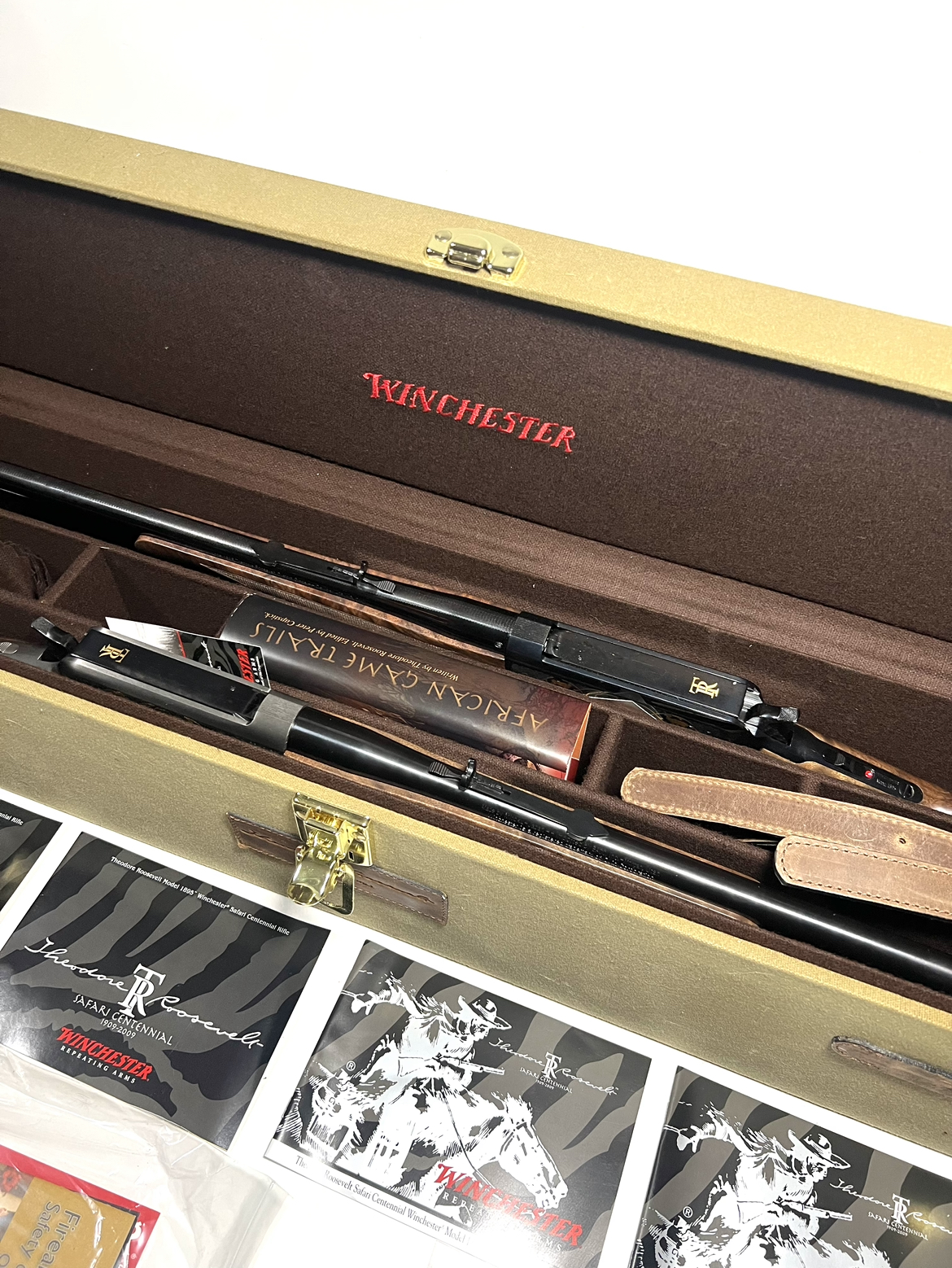 2 theodore roosevelt safari centennial 1895s chambered in 405 win, 2 slings, 2 cloths, all the owners manuals and paperwork, the book, both locks and keys to the box. these are both unfired new in box.