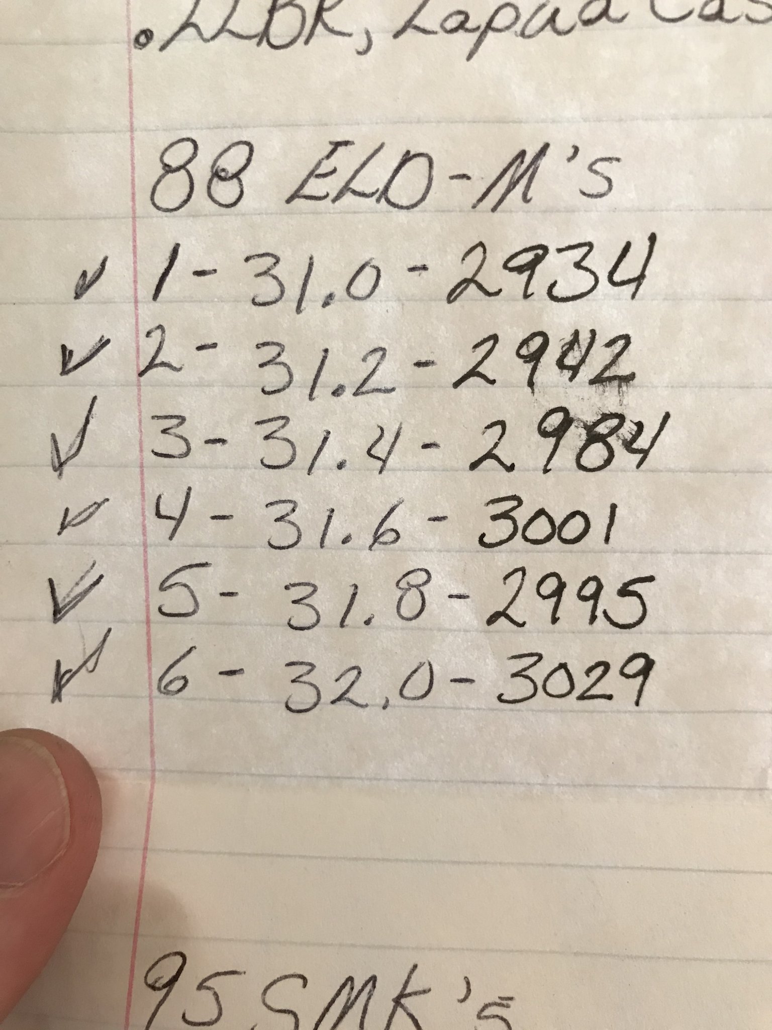 First, the 88 ELDM's and RL-16. I had ran a few over my old chrony to figure out what charge range I wanted to "ladder". I may have prejudiced my own results in the process, but I didn't want to be really slow, and didn't want to push things too much. We ran a magnetospeed and shot at 300 yards. Unfortunately, circumstances didn't allow us to drive back and forth to the target, and neither of us owns a spotting scope worth a crap. So I wasn't able to number the bullet holes in the target. But, looking at the numbers, I shouldn't be hard to figure out who landed where.