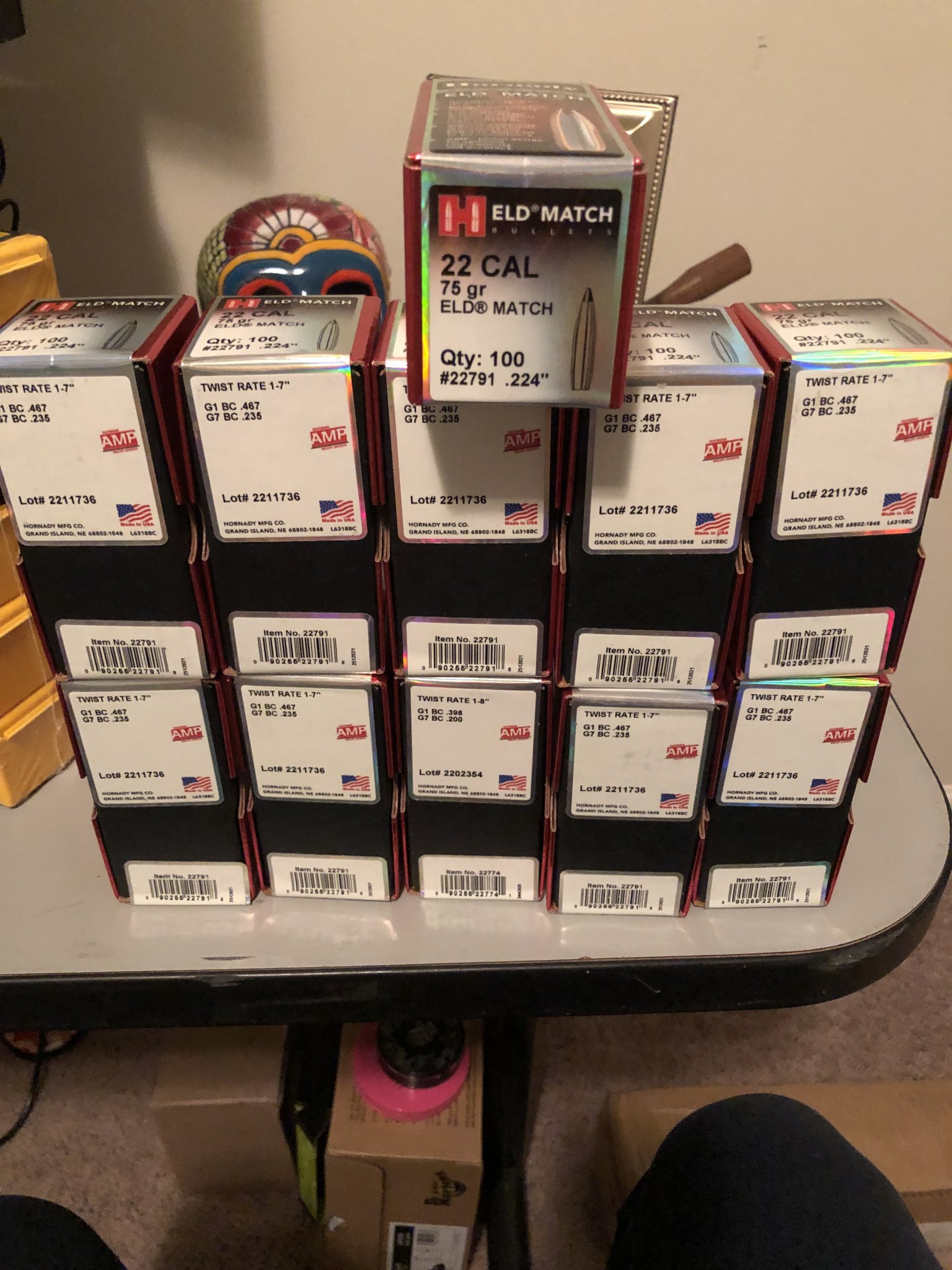 1100 rounds of hornady eld-m, 75 grain, 22 cal. Same lot number. $350 shipped