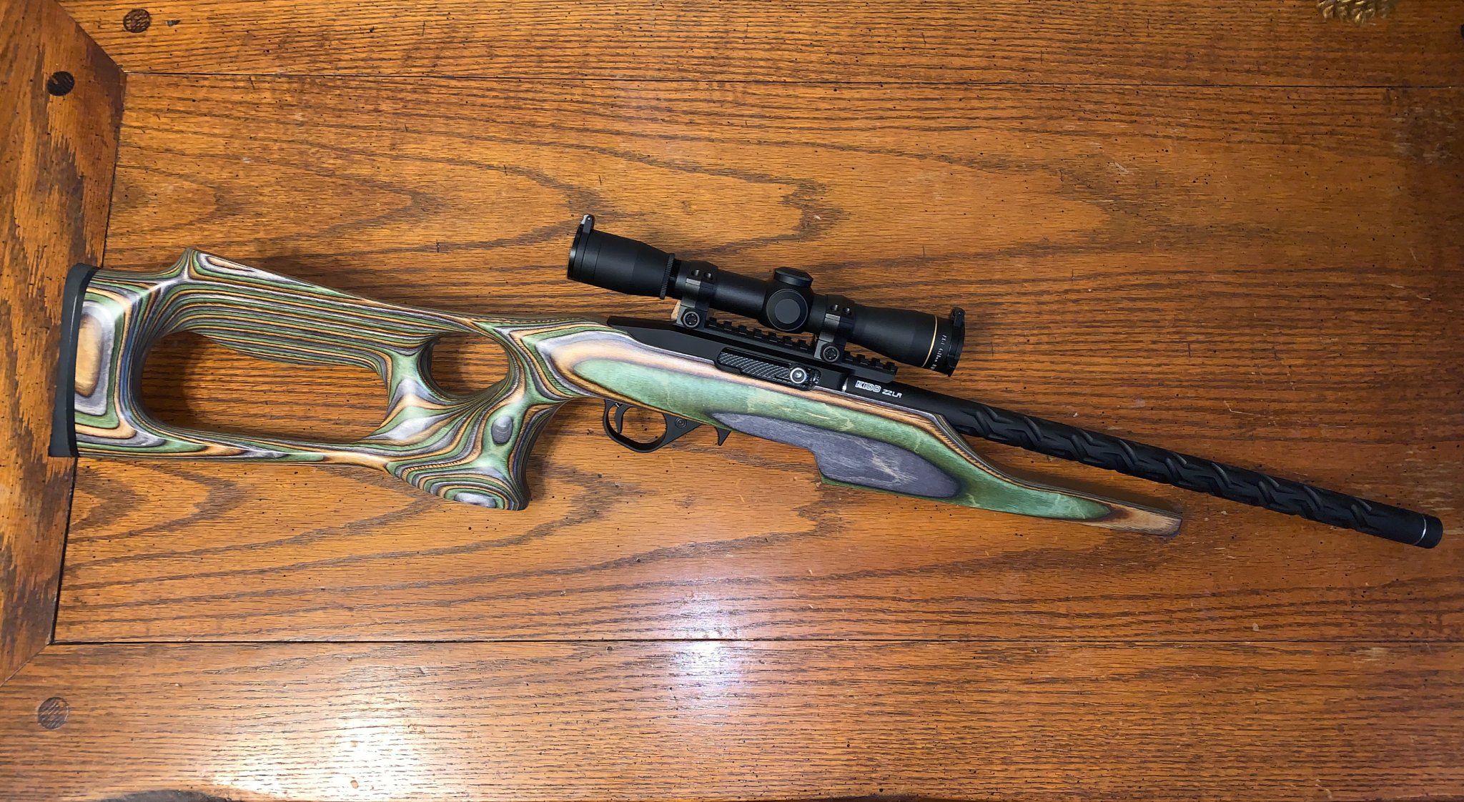 Got my new Kidd Squirrel gun home and put together. Kidd ULW barrel in classic slip fit receiver, single stage trigger (2lb pull), Leupold 4x28 Rimfire scope (with Leupold flip up covers), Warne 7200M low rings. 5lb 8.4oz total weight. Shoots bug hole 10 round groups at 25 yards (indoor range) with SV or HV ammo. Need to get it outside and see what it will do at longer distances...then in the woods for it's intended purpose.