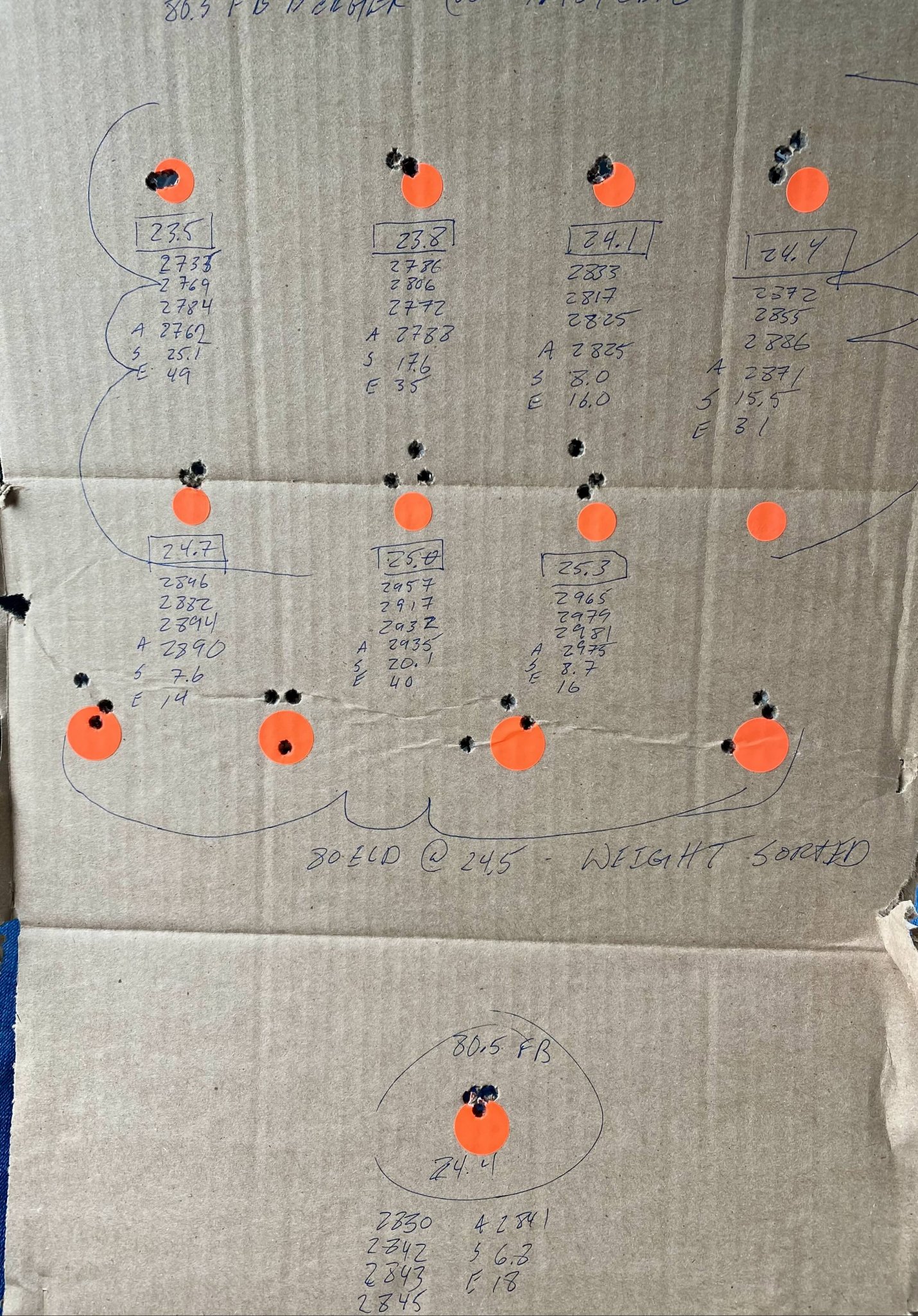 Here's one of my LD targets. It's not my best shooting, but it gives you an idea of where I ended up. In this example, six out of the eight groups shot with the 80.5s were half an inch or less. None of the four groups shot with the 80 ELDs were less than half MOA. Note the groups with the 80ELDM were shot first and the bottom group was five shots of the 80.5s with a random charge weight. Hopefully, this will give you an idea of possible velocities.