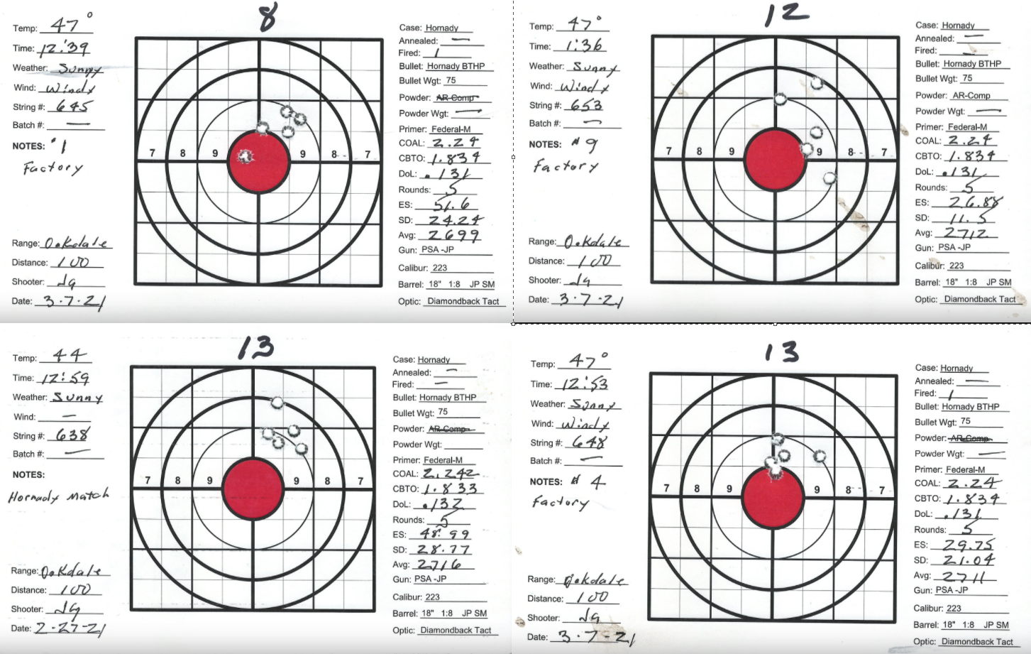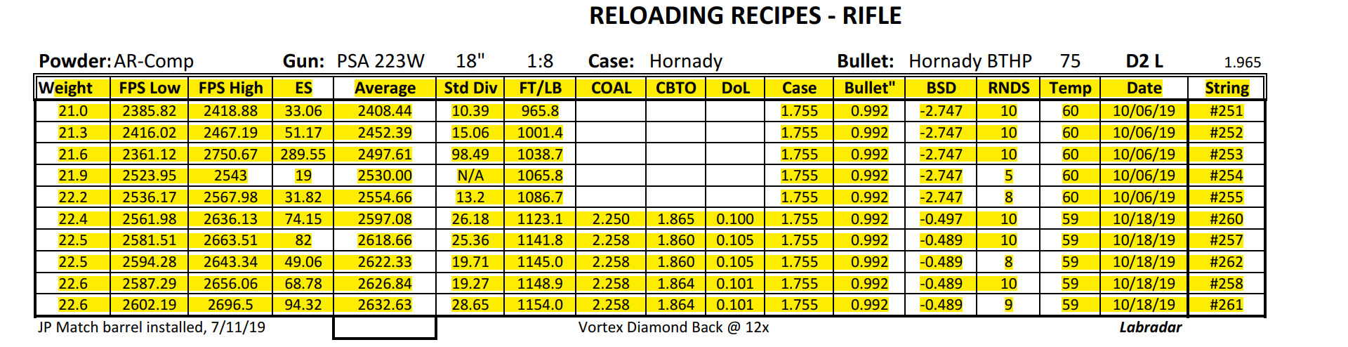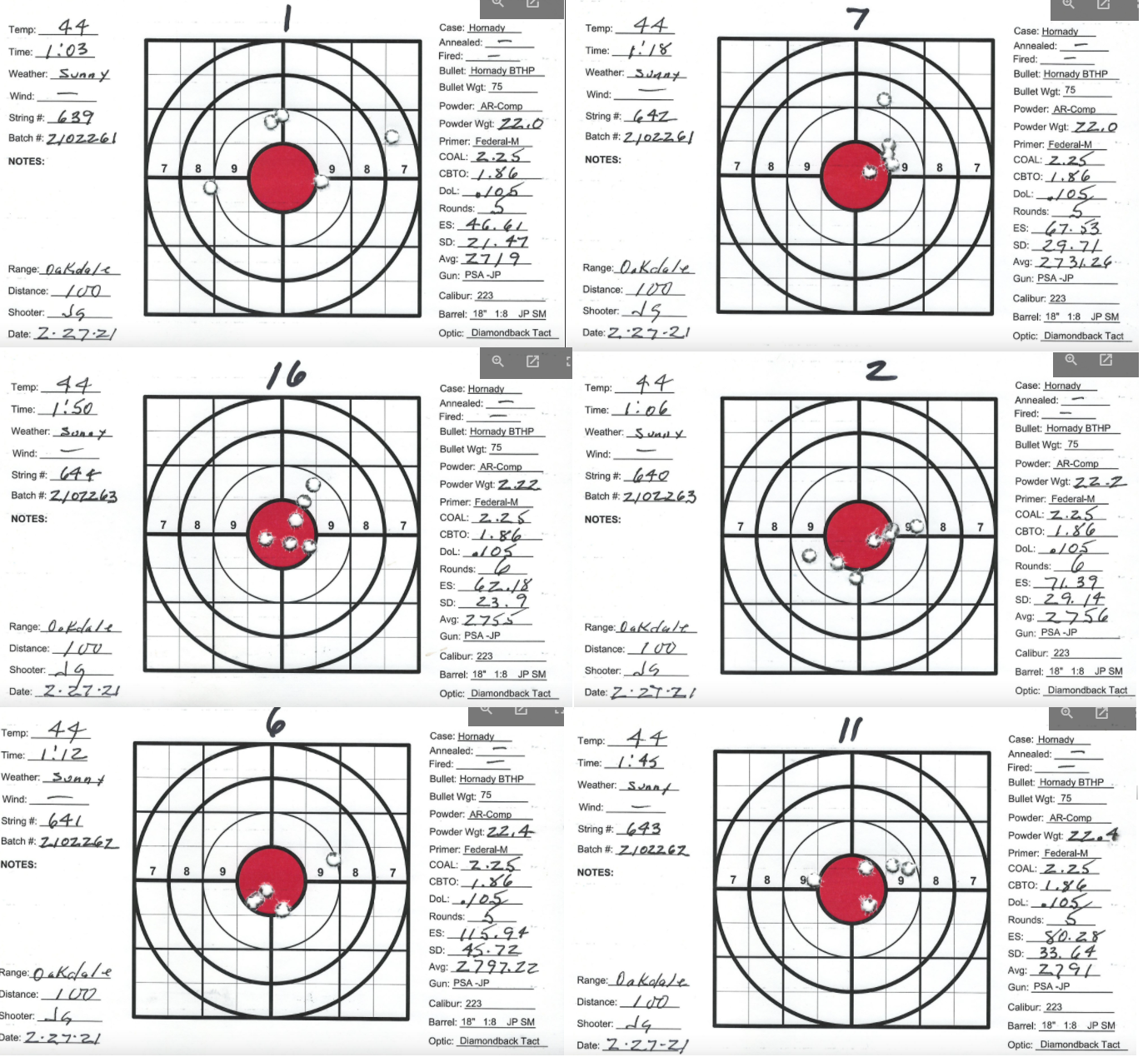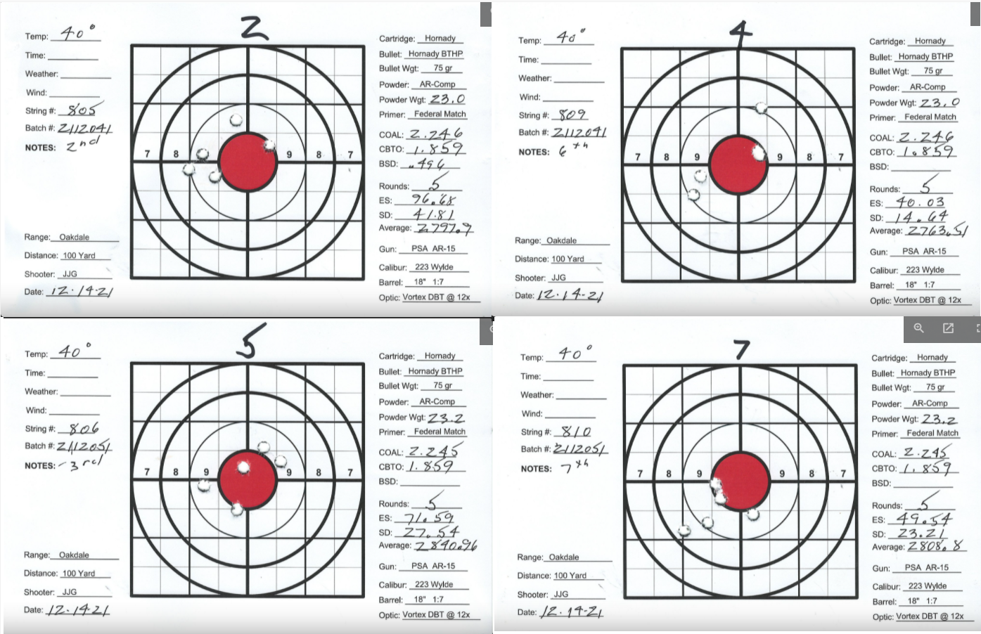 I have several precision bolt guns that I've manage to work up very accurate loads. Combination of QuickLoad, lots of Labradar strings and spreadsheet data analyses and worked up loads that pretty consistently yield 1/2" groups at 100Y. I also have a custom AR build as a semi-precision gun that I can't get to group. Really nice upper/lower/stock/trigger build with a JP Super Match 18" barrel and thermal dissipator. Had the barrel installation work done by the JP gunsmith, about $750 total. Get groups typically in the 1-1/2" +/- range. The gun SHOULD be good, can't get a consistent load. My other rifles are Lapua brass, Sierra bullets and Redding competition dies and getting SD's in the 4 to 9 range. Pretty happy with those. The 223 is the only setup using Honady Match dies, Hornady brass and Hornady 75g BTHP bullets. Brass prep includes bevel and chamfer necks, pocket prep. Using AR-Comp powder I'm getting SDs typically in the mid 20's up to the 40's. AR-Comp is NOT temperature stable if if they say it is. I finding velocity drop at higher temps, increase at lower temps. IE: 22.6g at 60 degrees = 2630fps, 22.6g at 40 degrees = 2755fps. 108% fill so 8% compress load with 100% burn.
