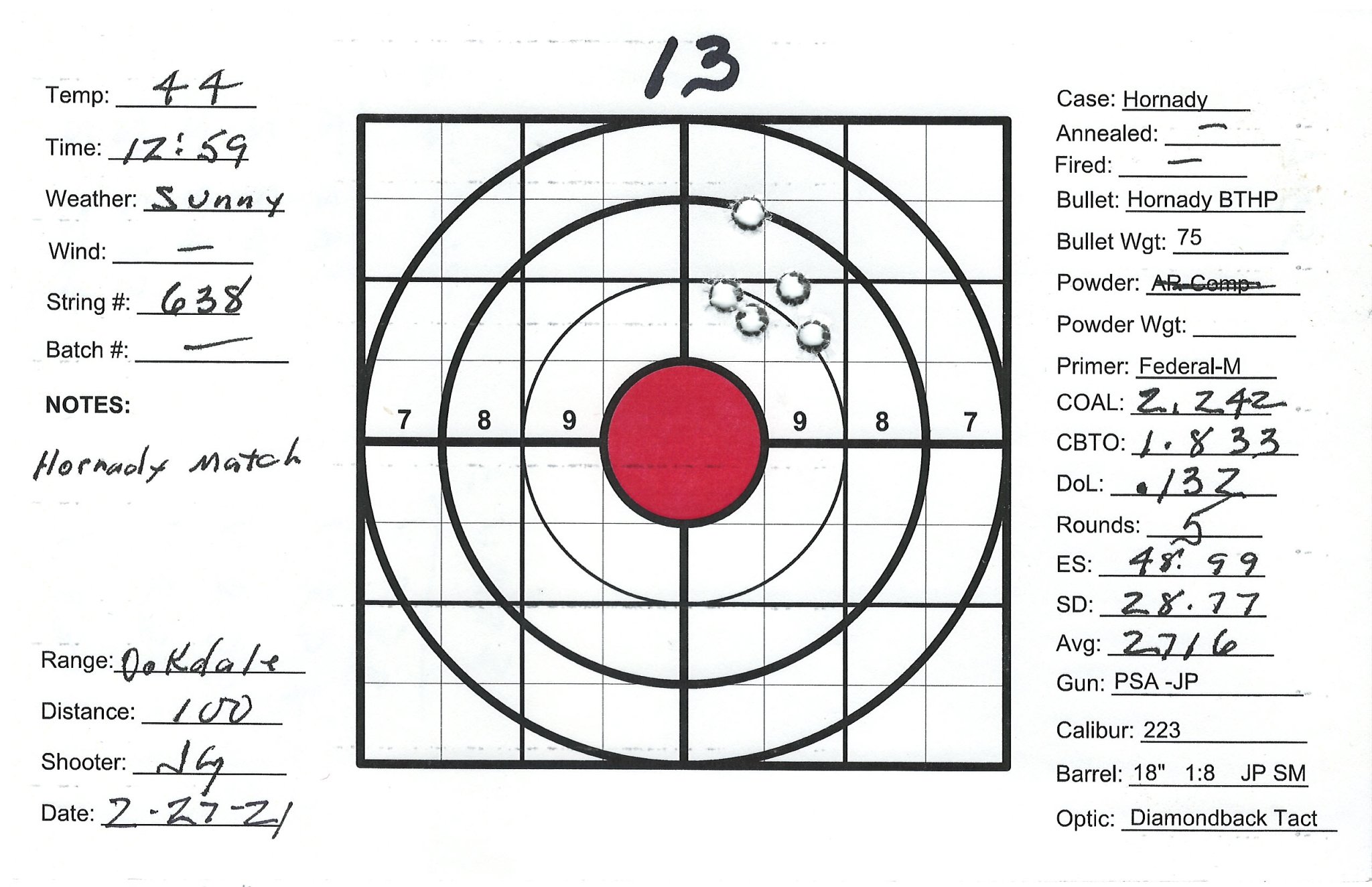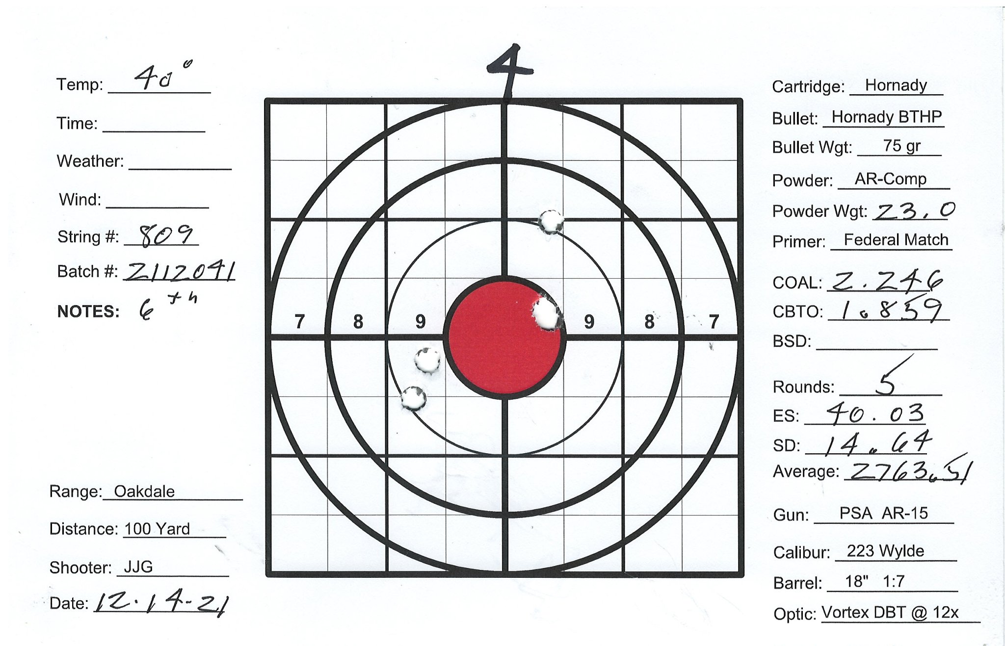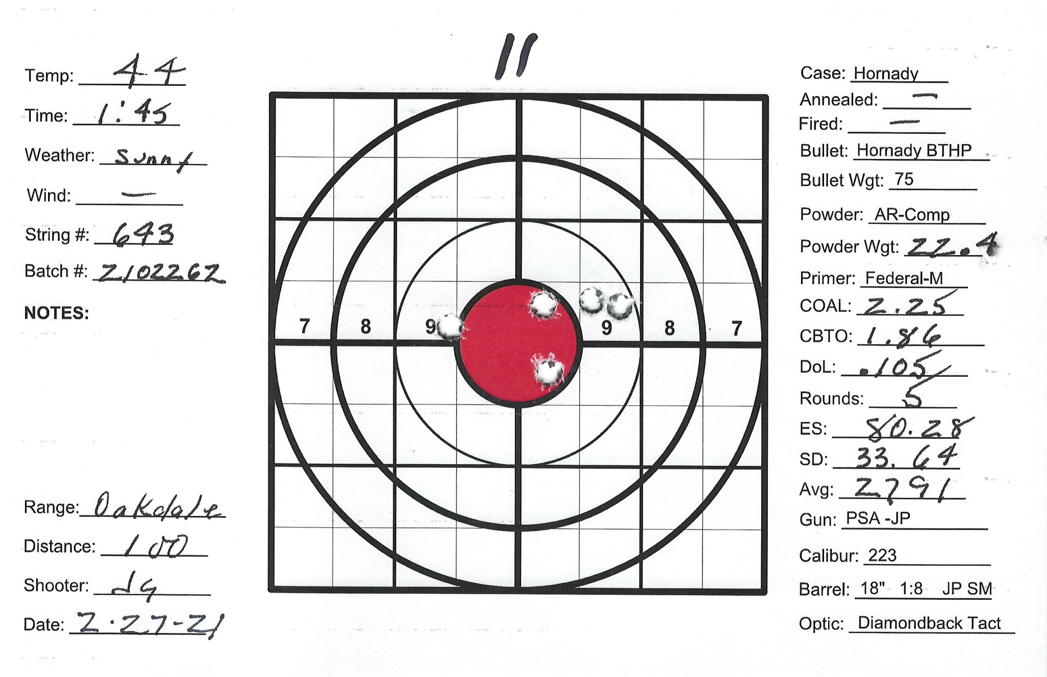 I have several precision bolt guns that I've manage to work up very accurate loads. Combination of QuickLoad, lots of Labradar strings and spreadsheet data analyses and worked up loads that pretty consistently yield 1/2" groups at 100Y. I also have a custom AR build as a semi-precision gun that I can't get to group. Really nice upper/lower/stock/trigger build with a JP Super Match 18" barrel and thermal dissipator. Had the barrel installation work done by the JP gunsmith, about $750 total. Get groups typically in the 1-1/2" +/- range. The gun SHOULD be good, can't get a consistent load. My other rifles are Lapua brass, Sierra bullets and Redding competition dies and getting SD's in the 4 to 9 range. Pretty happy with those. The 223 is the only setup using Honady Match dies, Hornady brass and Hornady 75g BTHP bullets. Brass prep includes bevel and chamfer necks, pocket prep. Using AR-Comp powder I'm getting SDs typically in the mid 20's up to the 40's. AR-Comp is NOT temperature stable if if they say it is. I finding velocity drop at higher temps, increase at lower temps. IE: 22.6g at 60 degrees = 2630fps, 22.6g at 40 degrees = 2755fps. 108% fill so 8% compress load with 100% burn.
