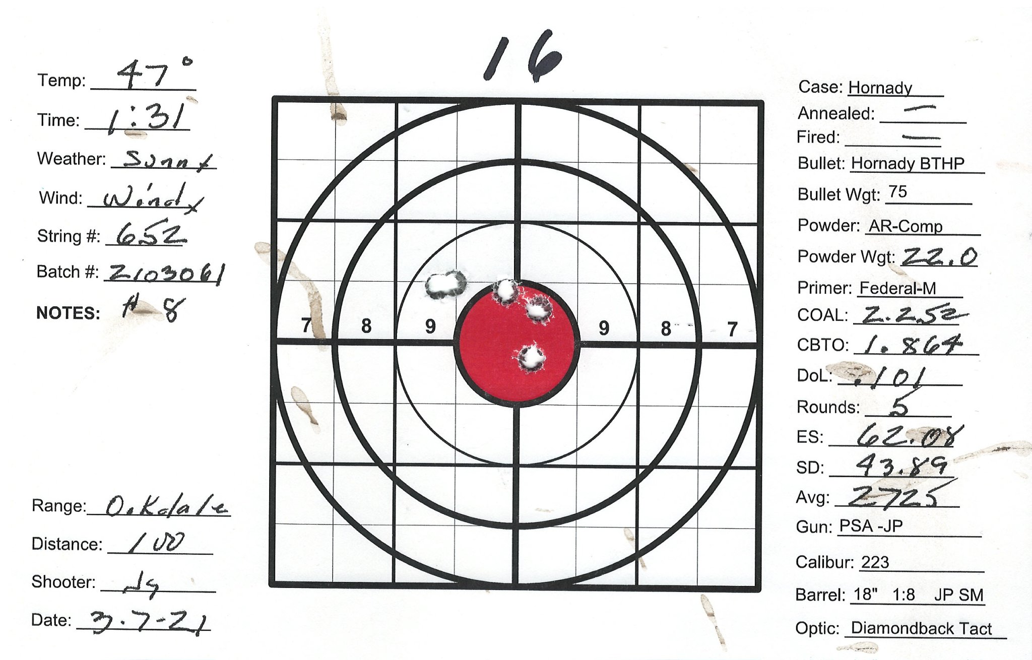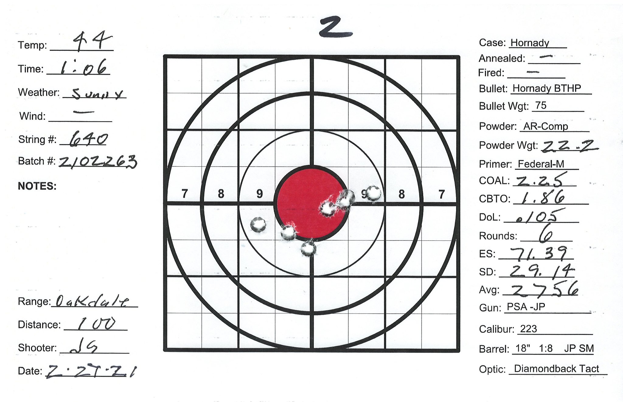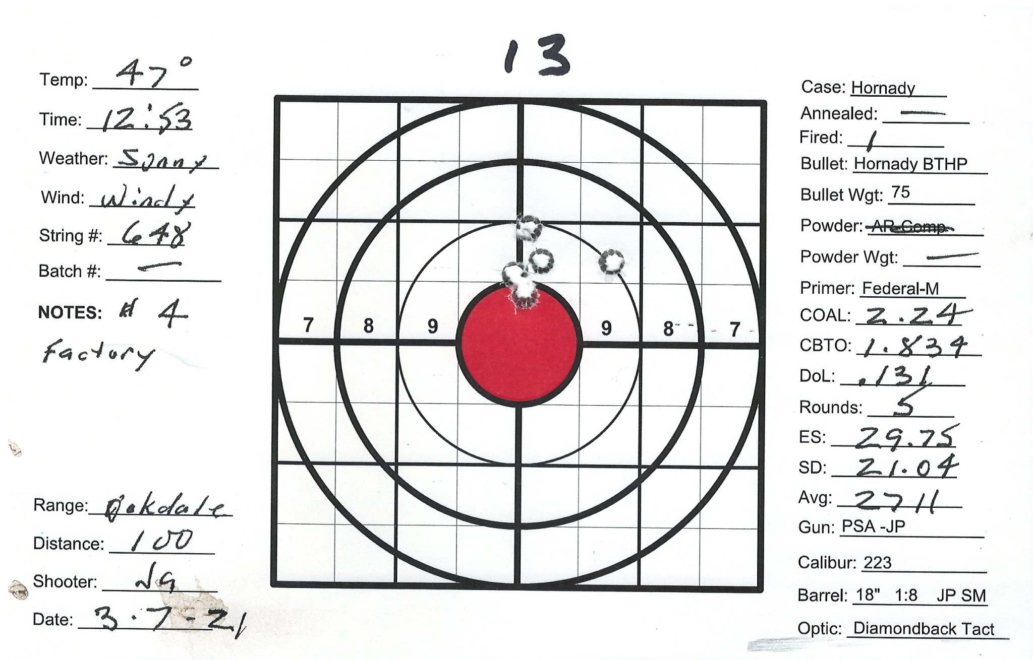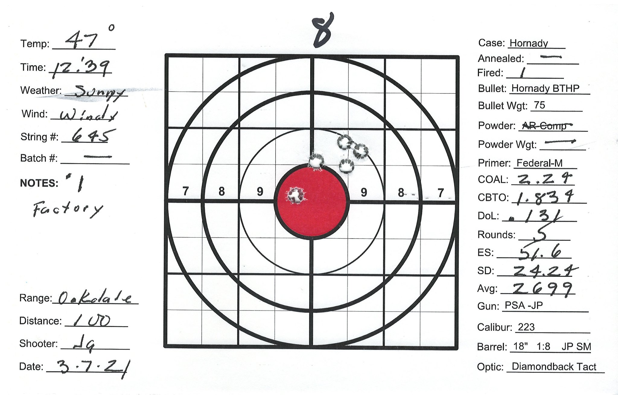 I have several precision bolt guns that I've manage to work up very accurate loads. Combination of QuickLoad, lots of Labradar strings and spreadsheet data analyses and worked up loads that pretty consistently yield 1/2" groups at 100Y. I also have a custom AR build as a semi-precision gun that I can't get to group. Really nice upper/lower/stock/trigger build with a JP Super Match 18" barrel and thermal dissipator. Had the barrel installation work done by the JP gunsmith, about $750 total. Get groups typically in the 1-1/2" +/- range. The gun SHOULD be good, can't get a consistent load. My other rifles are Lapua brass, Sierra bullets and Redding competition dies and getting SD's in the 4 to 9 range. Pretty happy with those. The 223 is the only setup using Honady Match dies, Hornady brass and Hornady 75g BTHP bullets. Brass prep includes bevel and chamfer necks, pocket prep. Using AR-Comp powder I'm getting SDs typically in the mid 20's up to the 40's. AR-Comp is NOT temperature stable if if they say it is. I finding velocity drop at higher temps, increase at lower temps. IE: 22.6g at 60 degrees = 2630fps, 22.6g at 40 degrees = 2755fps. 108% fill so 8% compress load with 100% burn.