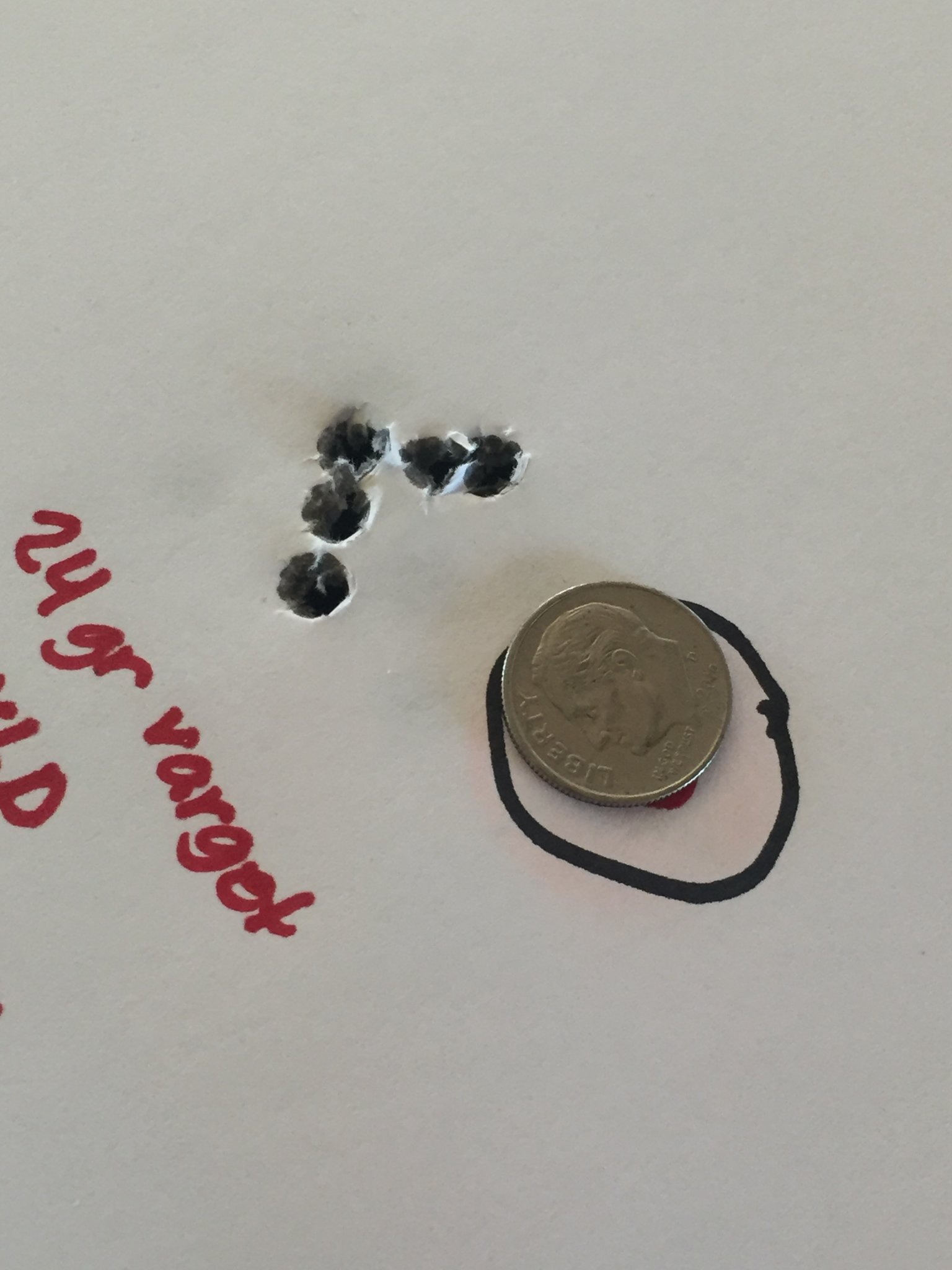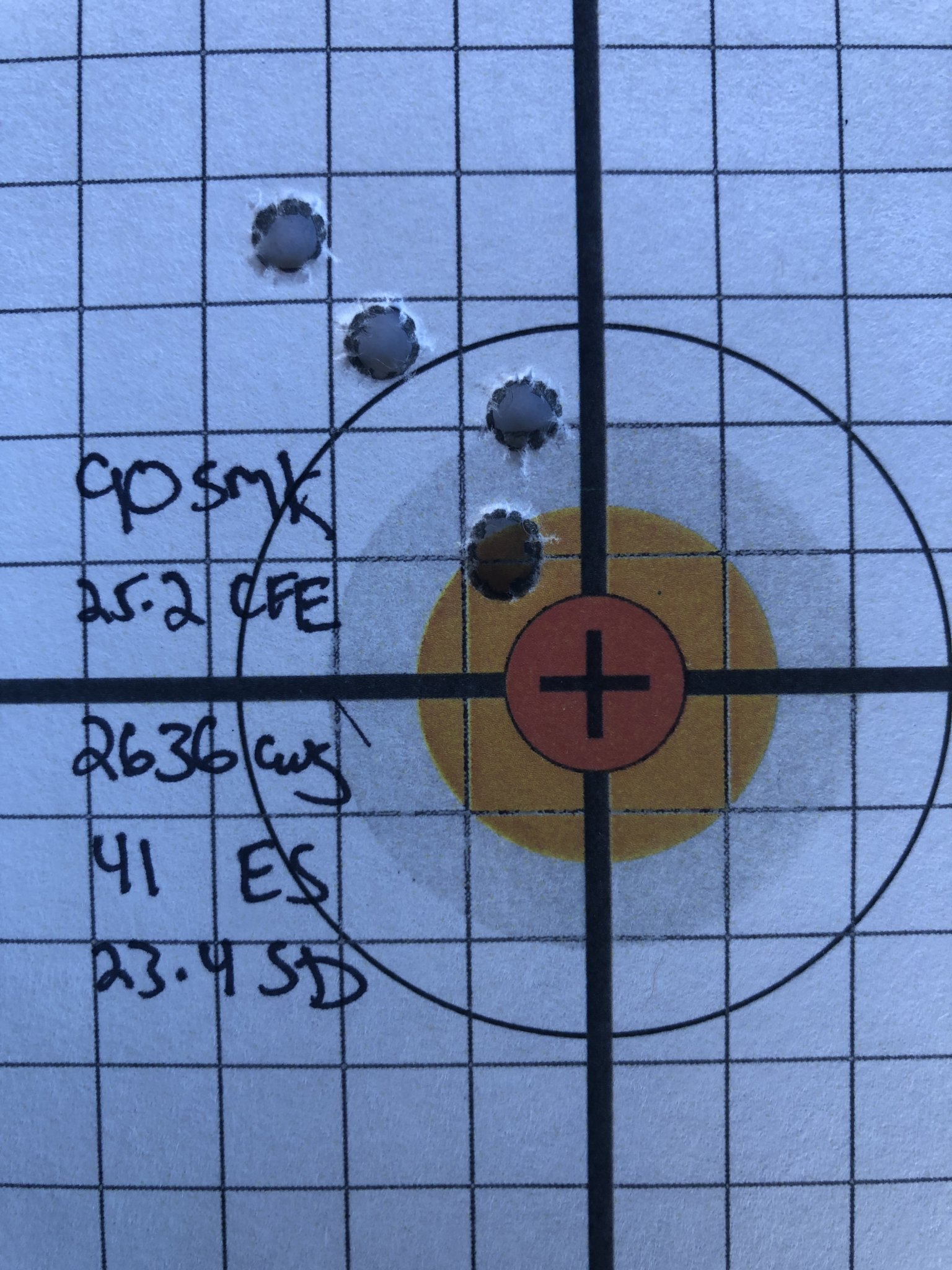 Thanks for posting that data. I tried out that node and found a little less speed, 2650 for the 23.9g. This charge produced a .639” group with two of the three shots in a hole that looked like one. Hoping it was just the shooter that opened it up further?. Time to play a little with depth. This group came with a jump of .020 from lands. FWIW, the 23.7g charge produced a .472” group with same jump and 2622fps. Barrel is a 22” Rock Creek 6.7t and the COAL at lands for this bullet is 2.305. I’ve been able to get a max oal of 2.295 into the magazine, but that’s about it.My first attempt at a ladder test. I did two shots per load. I was impressed with how linear the speeds were. I'm looking at 23.9 -24.1 for a possible node to test further.
