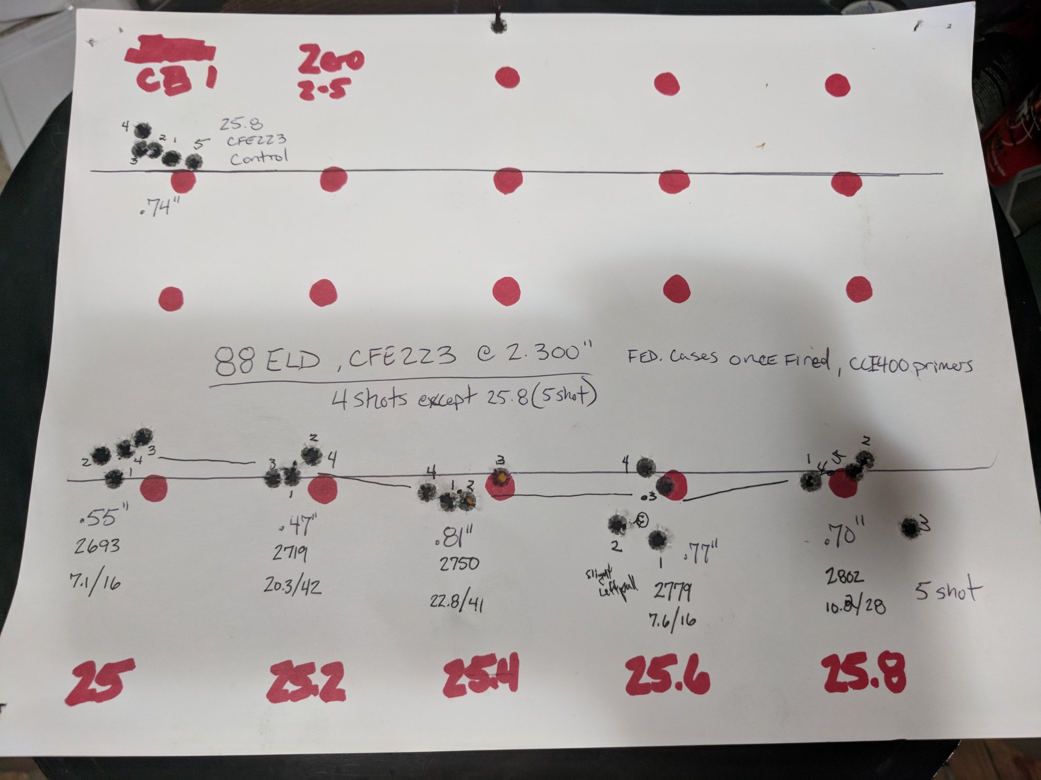 Here is OCW with 88ELD and CFE 223. Nodes at 25-25.2 and 25.8-26 (very hot load and 26 is known from prior testing). SD is my fault for changing shoulder pressure/bipod load for middle two groups. View attachment 6930998
