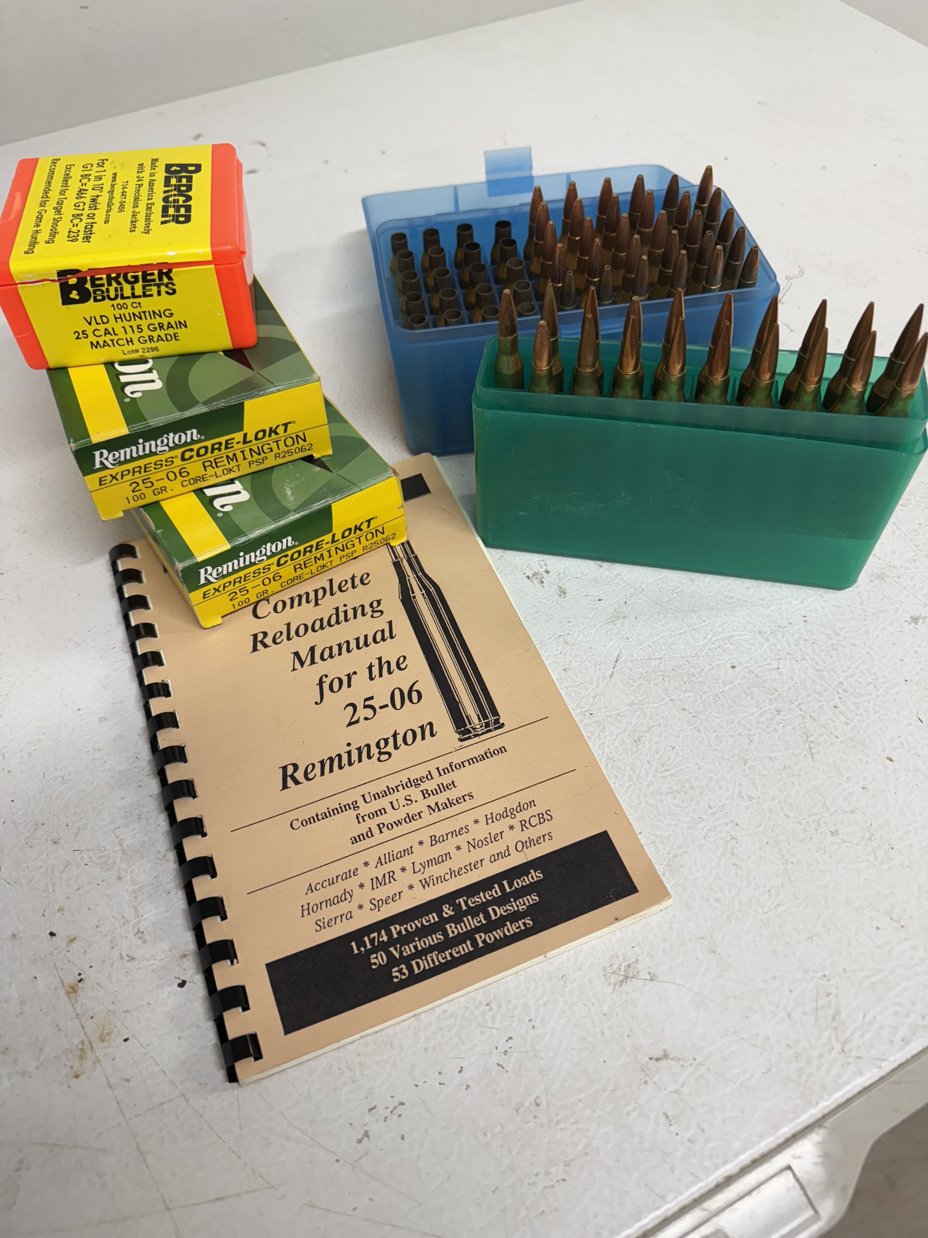 Here's a mixture of 25-06 ammo, brass and 45 Berger 115 vld's. Got this stuff in a bundle of things from an estate sale, so not sure of the accuracy of any of it, but all the cases say 25-06. The two Remington Core-Lokt box's are full, but not sure if it's actually that.