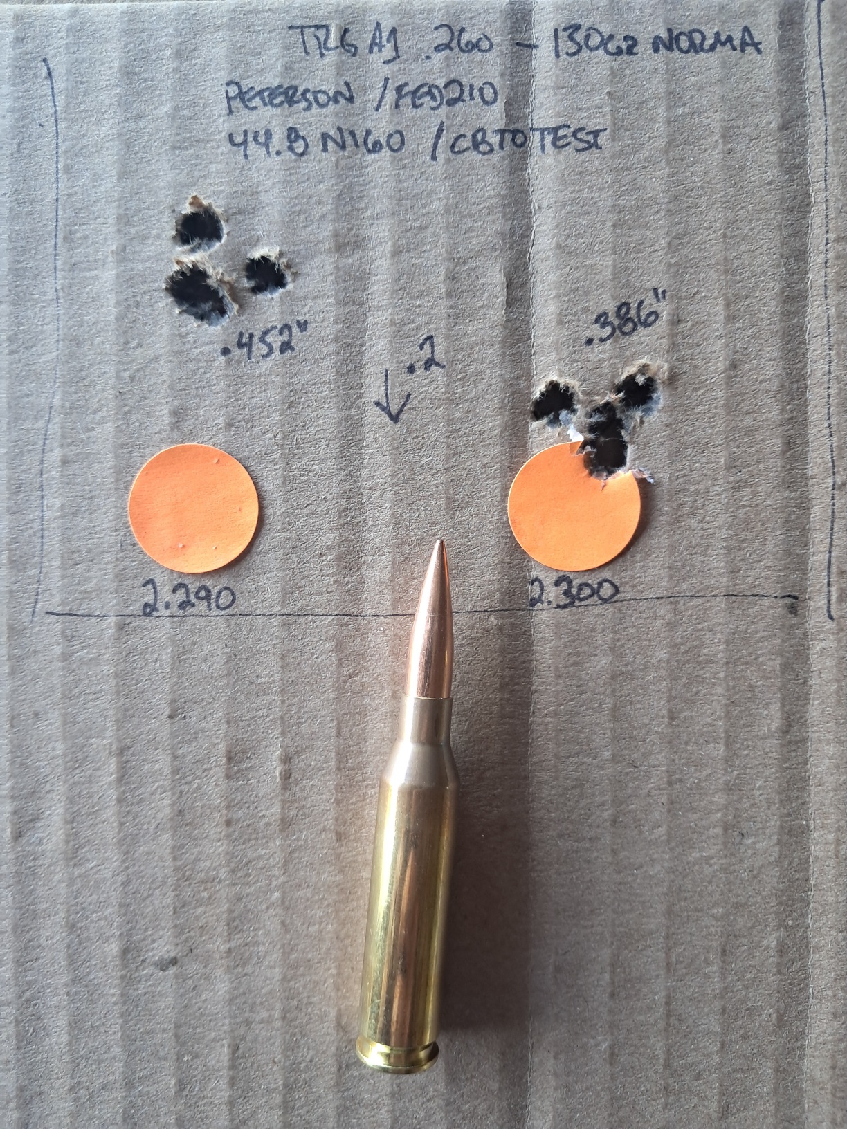 Having ran out of 130gr ELD-M, I tried the 130gr Norma Golden Target this afternoon. I kept the charge weight of N160 the same at 44.8gr, and just messed with seating depth a little. There is a ton of room in the throat of that TRG. 2.925 was my max mag length, and I still wasn't at the lands. (2.925 OAL = 2.310 CBTO).