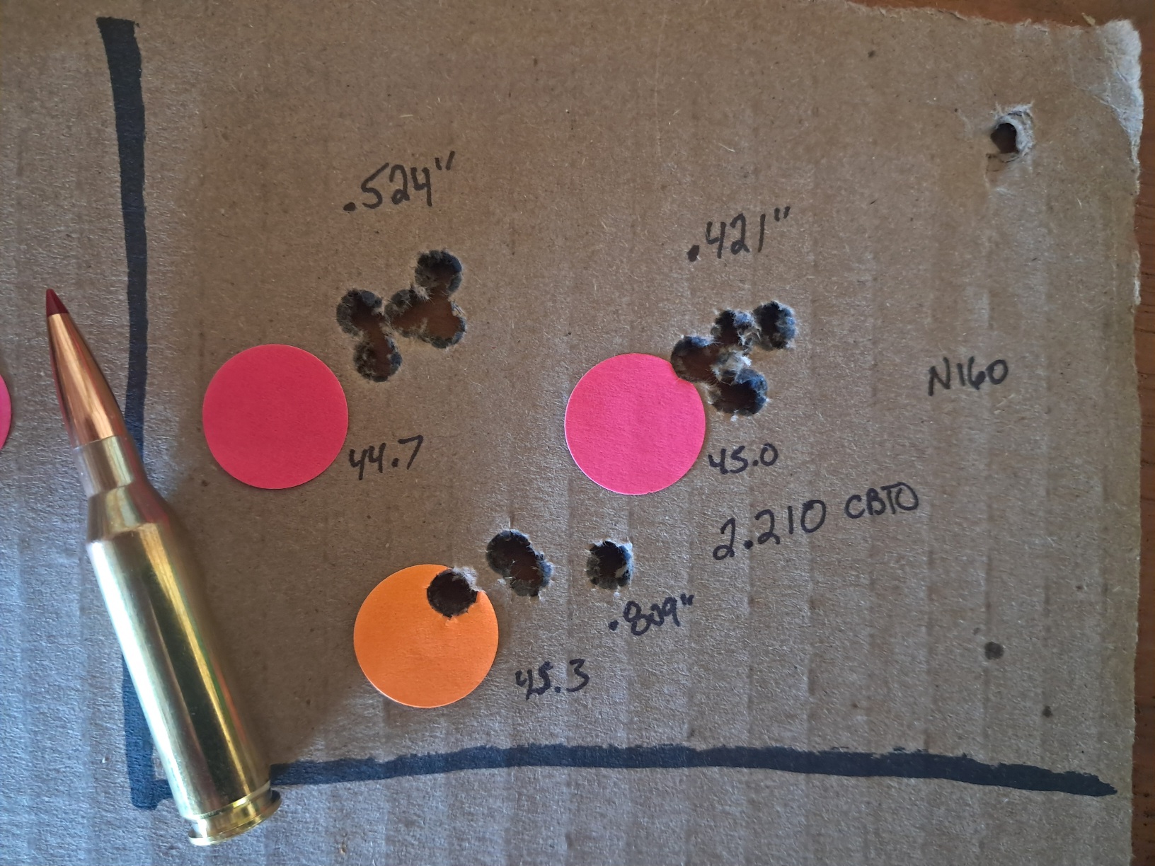 44.8 is where I stayed at, and I tested it again at 300 and 650 where I trued the velocity to basically 2,800 FPS on the nose. SD was under 10, but not by much. It shot a half-minute at 300, and 2/3 MOA at 650...which is perfectly fine for me. The low shot at 650 was me, but it wasn't out of the group enough to discredit it.