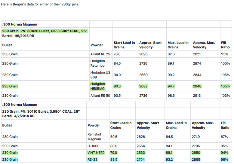 I would recommend you try Retumbo with the 230 gr. berger (I think Retumbo will give you better case fill). Any quality brass should work, I recommend you anneal and bump the shoulder 0.002" so as to minimize brass wear. Attaching someone else's information previously presented on this forum: