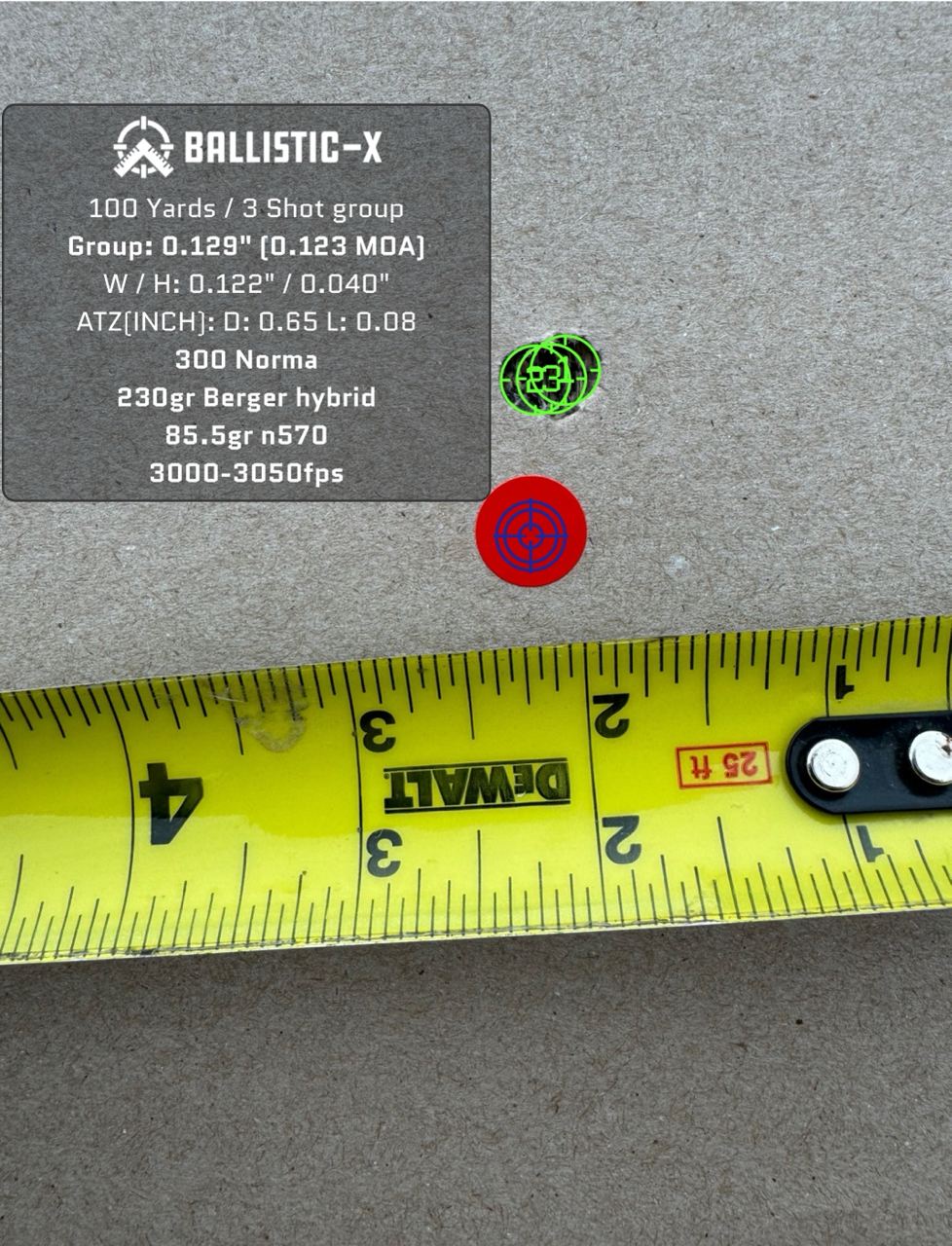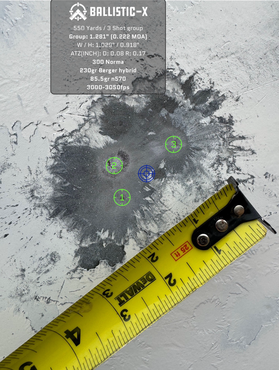 For this rifle, also chambered in 300 Norma I am using a 26" CA carbon fiber barrel. I tried 85-87 grains of VV N570 and BMG 50 with 225 gr. ELD-Ms all of which shot very well across the entire range. The velocity with BMG 50 was too low so I need to run more tests at higher charge weights.