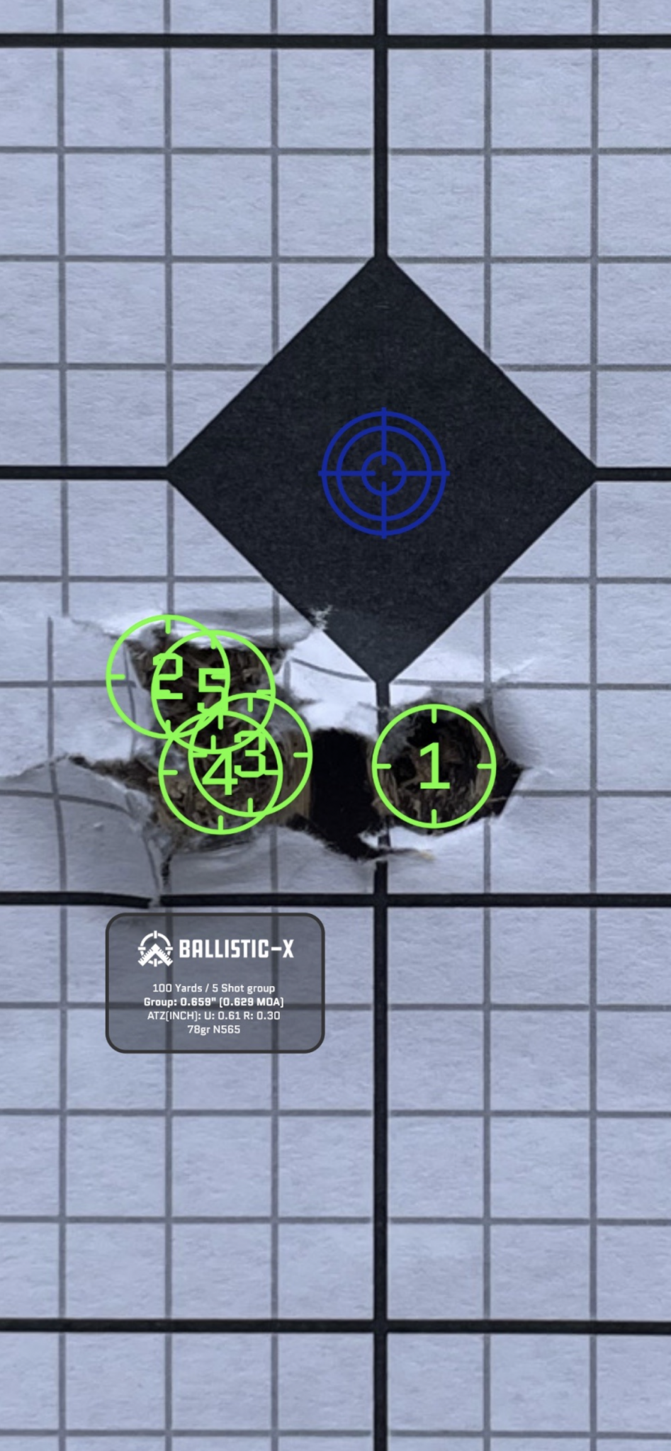 Also had 5 rounds of 78.0 grs N565 with Berger 230 HT leftover and they shot .63moa @ 2778, see picture.