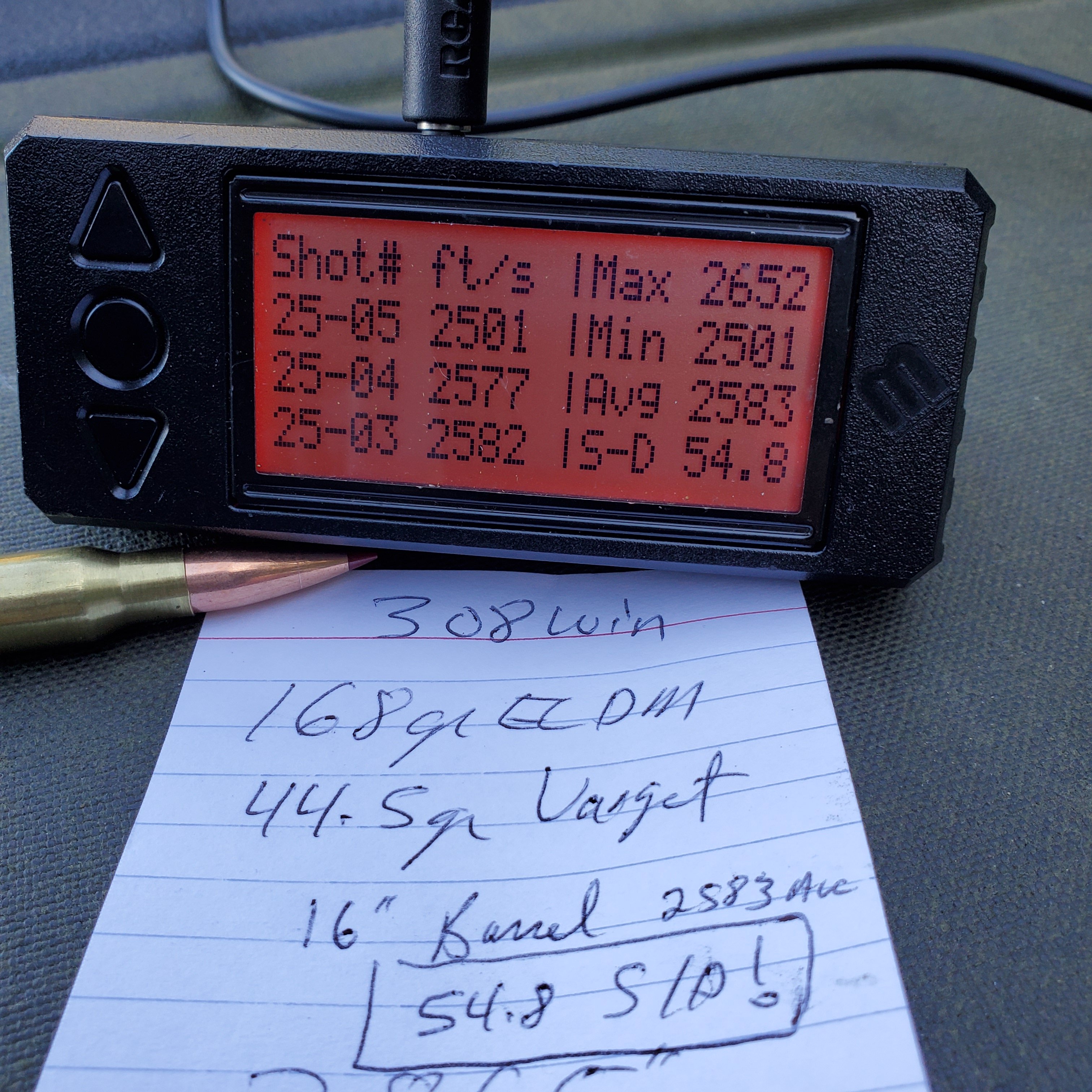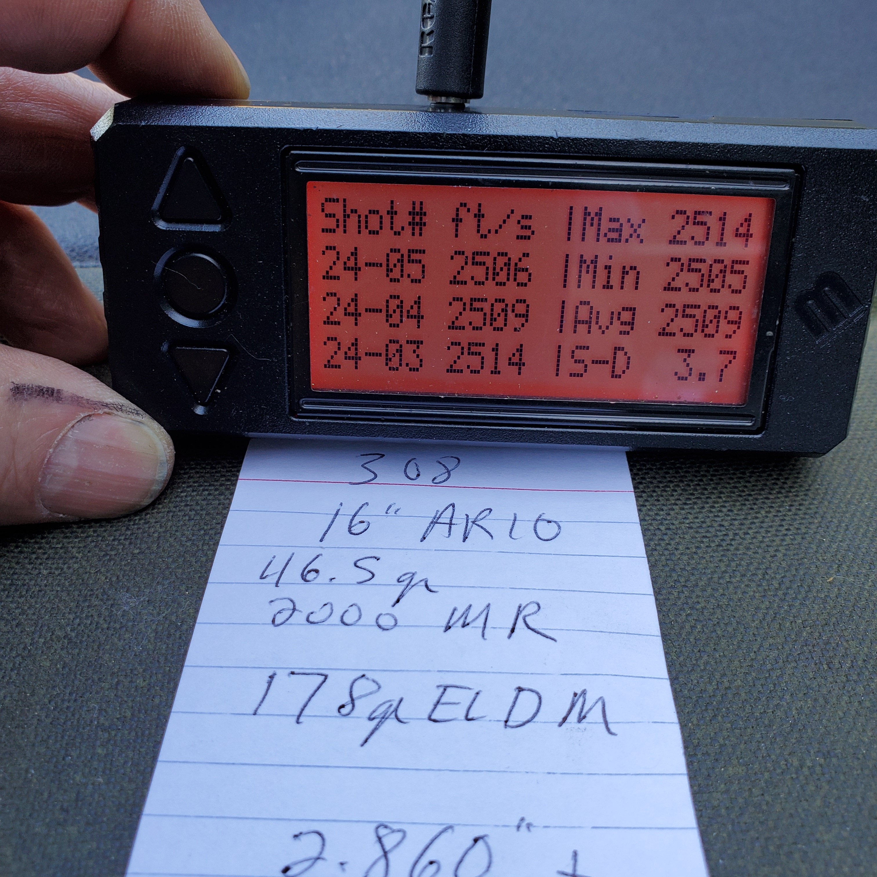 The 16" AR 10 also loves the 168 eldm at 2756 fps ave it provides 1/2" 5 shot groups in an ultra light 6 lb AR 10, without scope. So I tend to load the 168 eldm for it...but it shoots the 177 SMKs almost as good too.