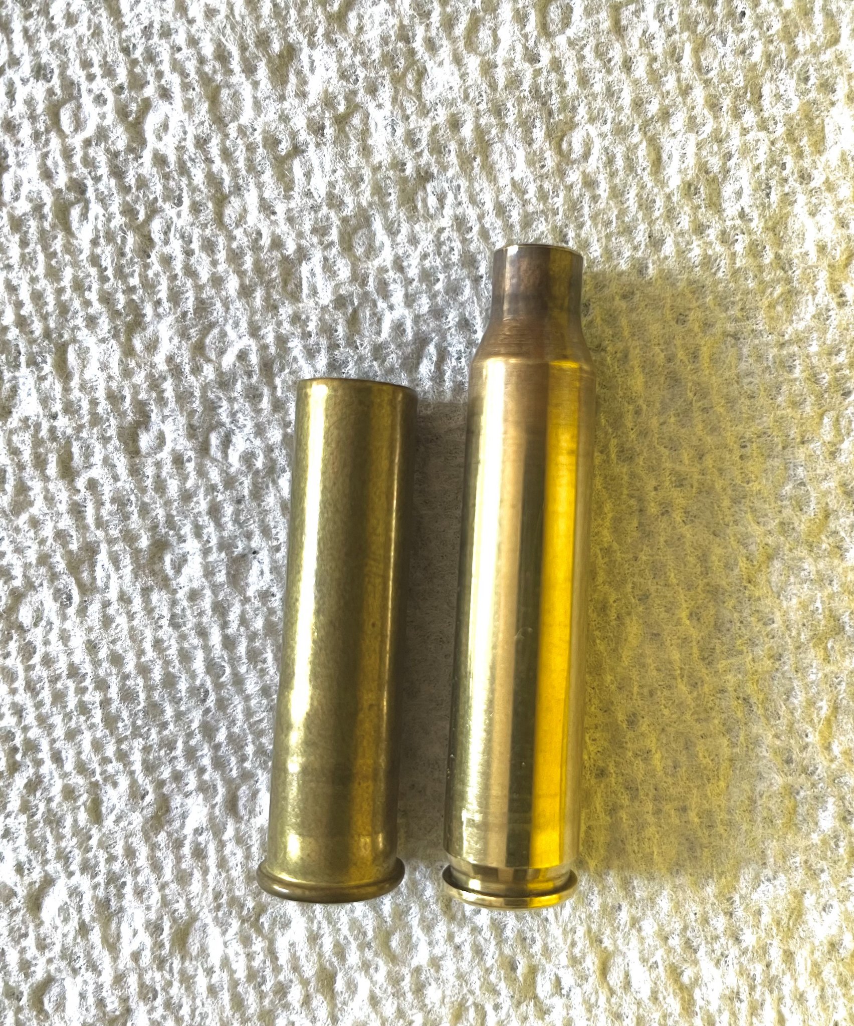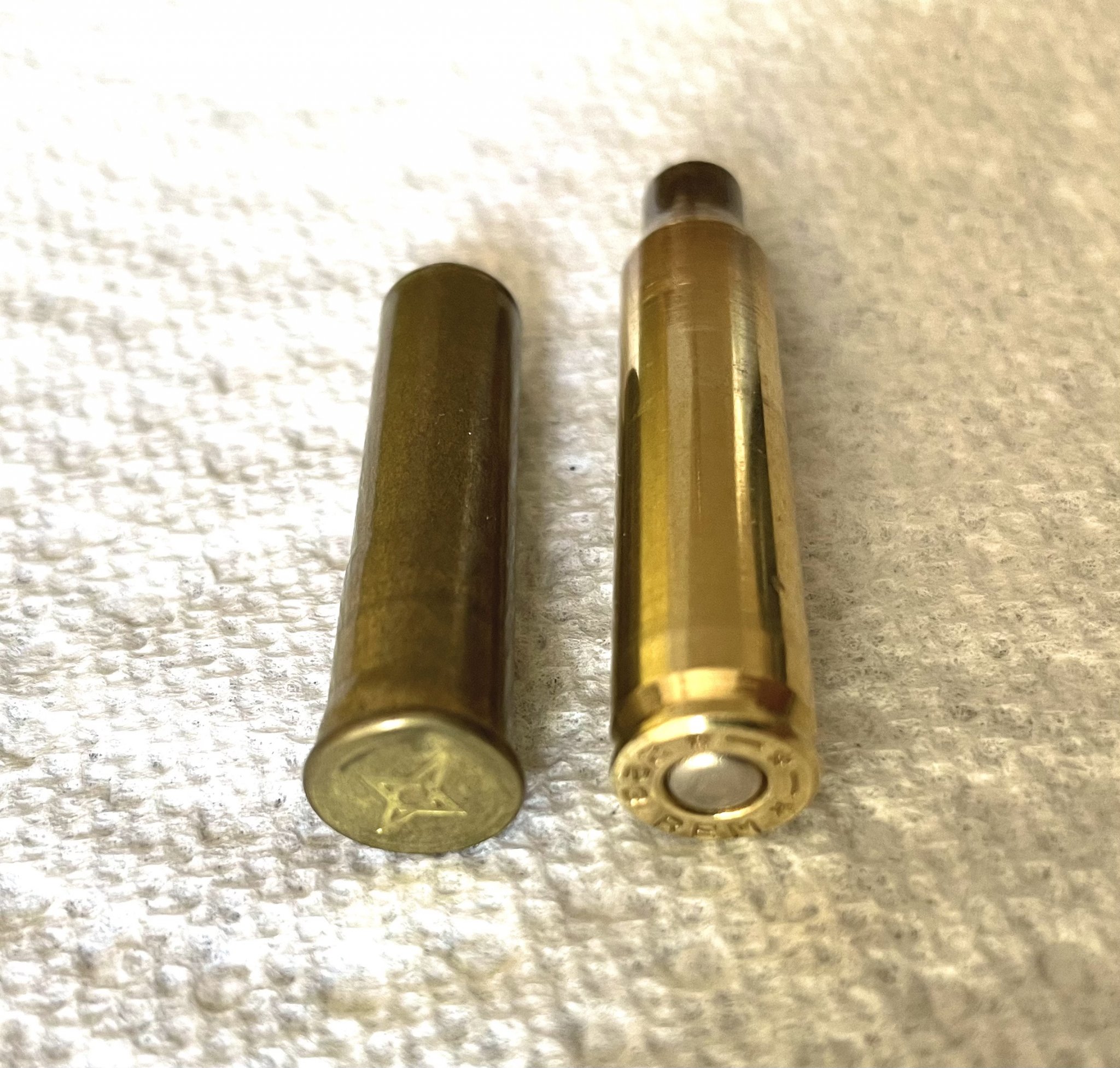 I don't remember where I picked this up; came across it doing a cabinet cleanout today. Case mouth is in .32 caliber range, shown next to a .223 case. Looking carefully, you may see that there may be a crimp at the case mouth - was there a card wad to hold in... whatever? While the image of the bases isn't focused well, you can see the firing pin indentation at 12 0'clock.