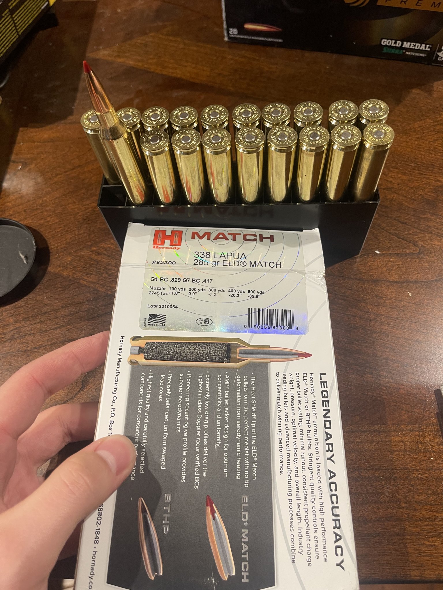 1 box- 338 lapua Hornady eldM 285, missing one out of the box-$70