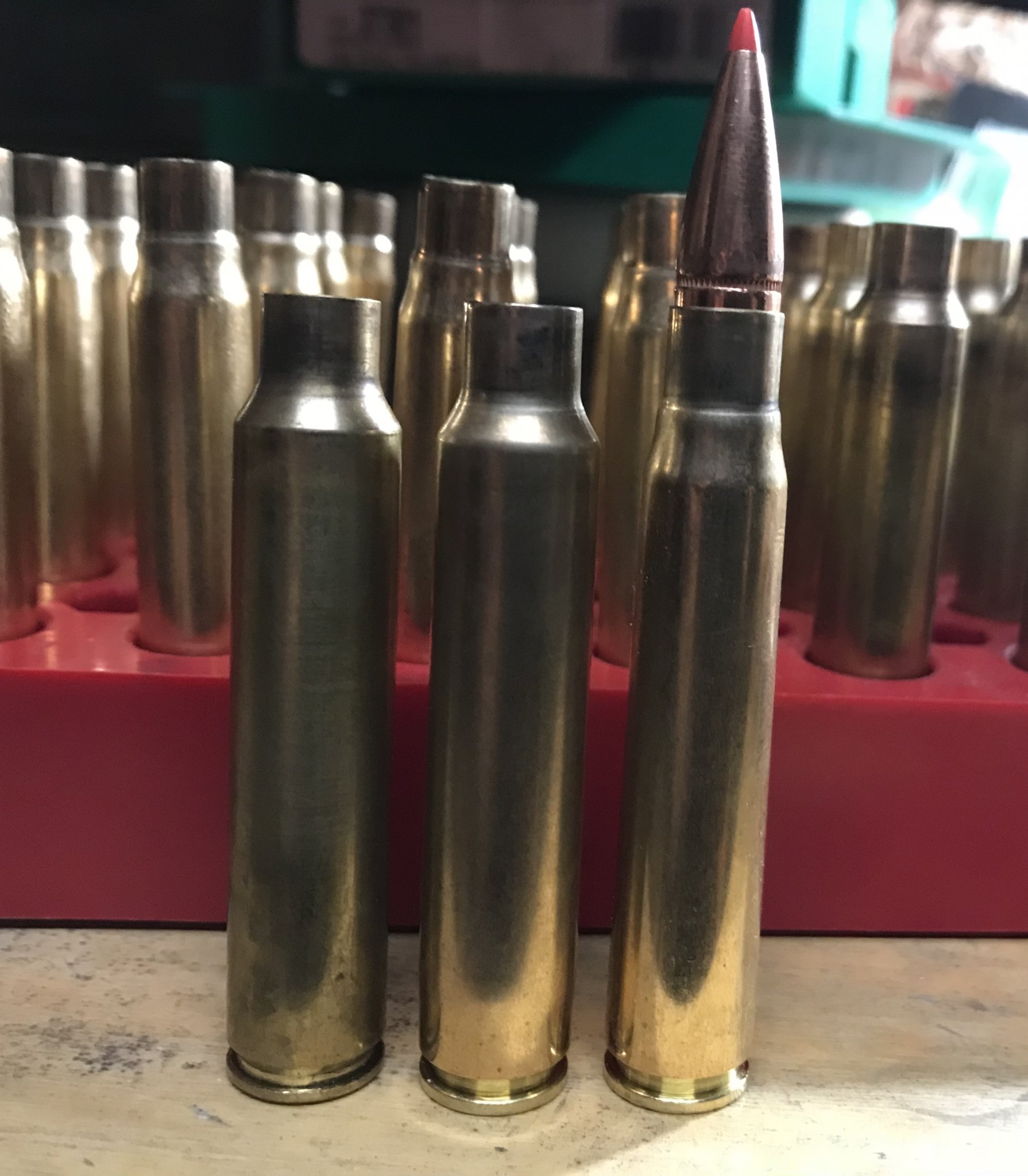 Now I take the 8x68s brass, neck up to 375, then neck down to 338 forming a false shoulder. I’m using rcbs 375 ruger fl die, 338 rcm seater and fl die adjusted appropriately.