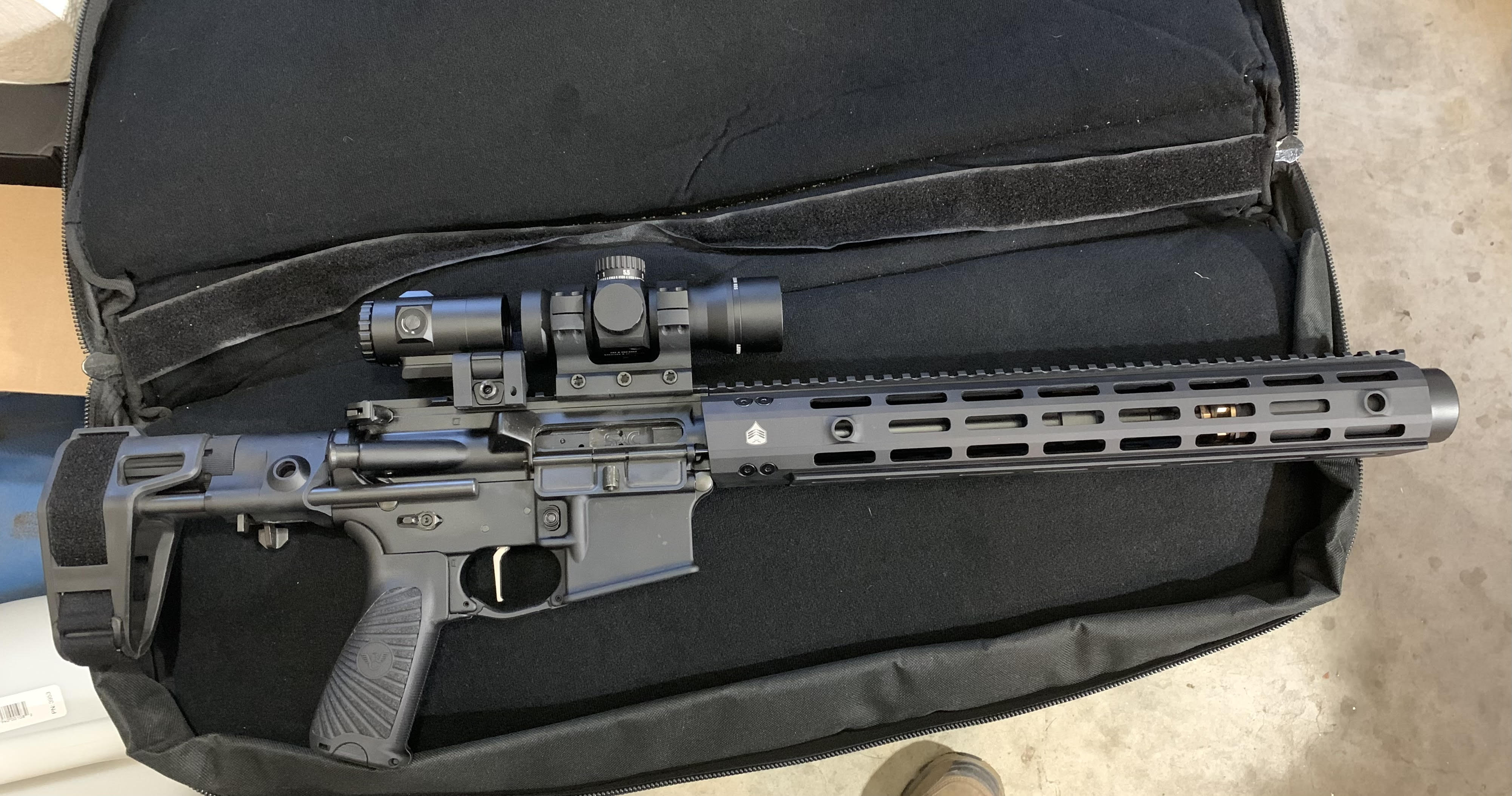 A pistol with a 15" Arca rail why not. It's certainly not hearing safe, but sounds good. Didn't get a face full of gas. Closed gas in 5 clicks to bring ejection back to 3:30.