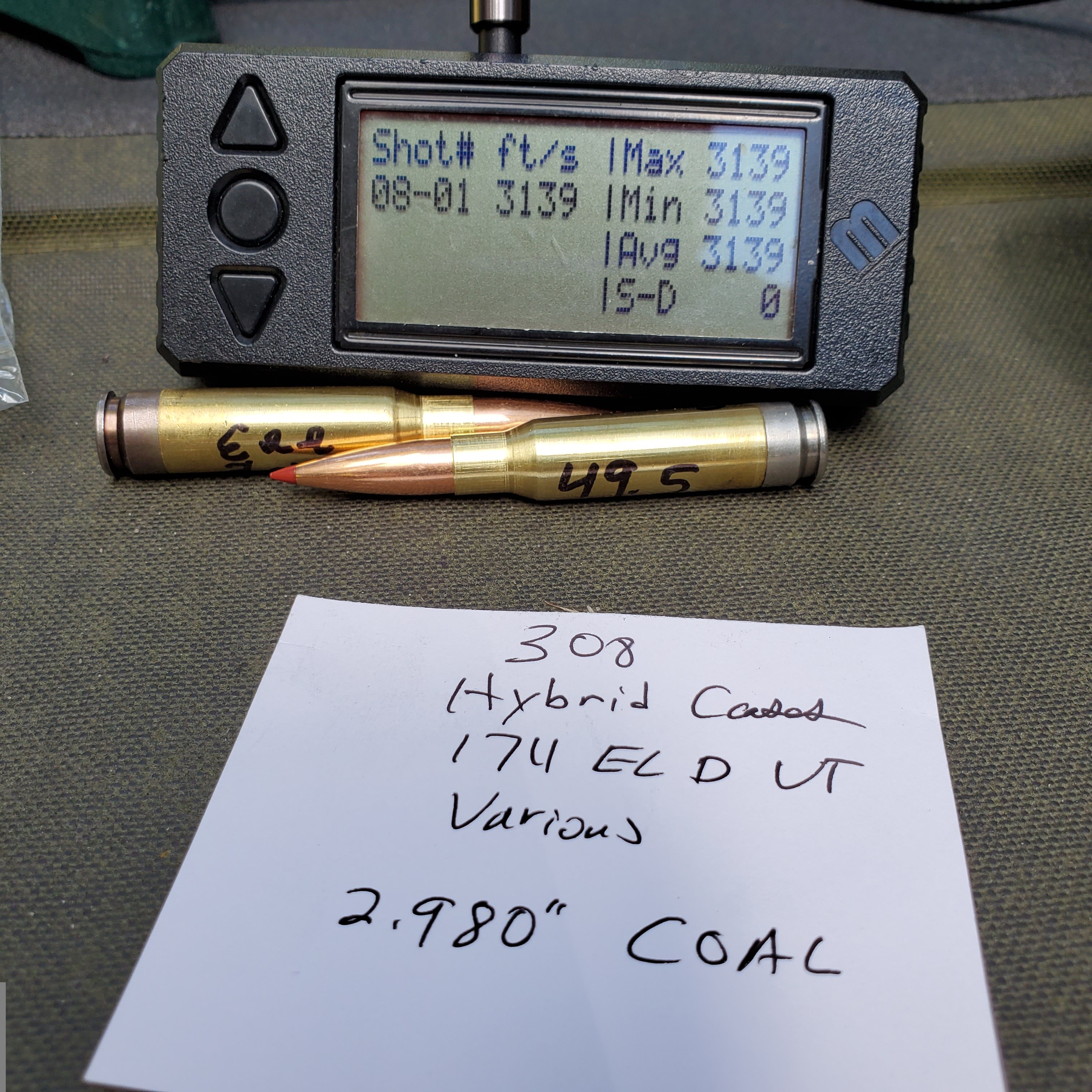 Those are some impressive loadings.308 Win hybrid case 174 ELD-VT 3139 fps 3806 ft/lbs of muzzle energy.