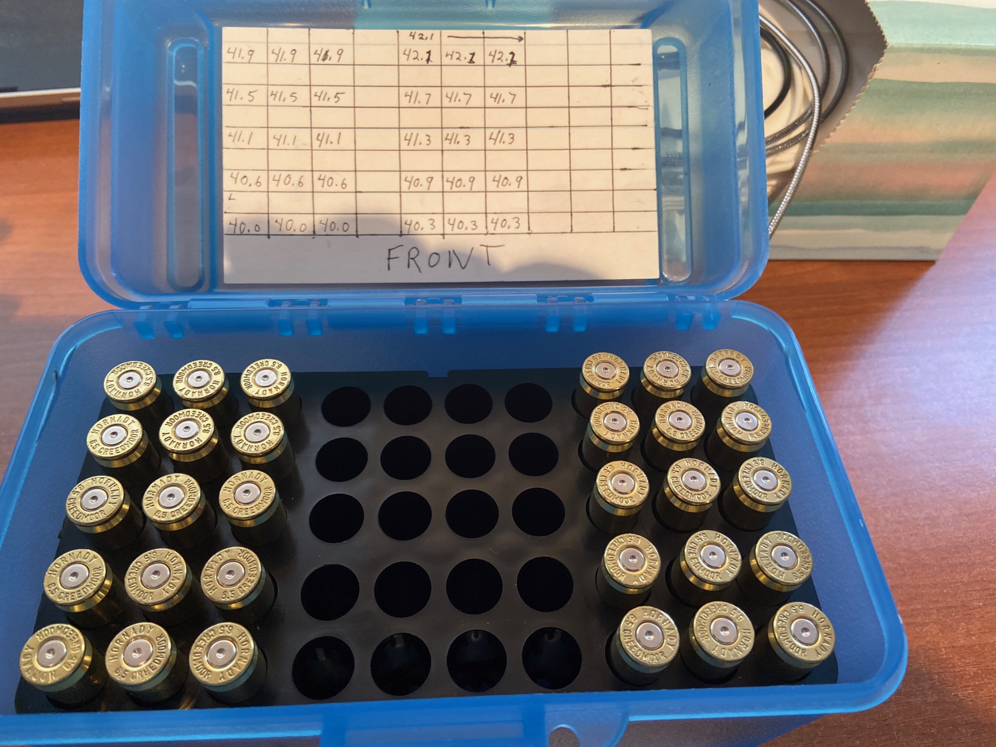 Question is: next steps. I'm thinking to next load a set of cartridges and focus on the 40.9 - 41.2 range and 41.6 - 41.9 and do so in .1 gr increments. That's eight different charge weights and I'm considering increasing the number of cartridges at each weight up to five for this round of testing. If that gives me a smaller range to zero in on, then perhaps for the 3rd go I will go up to 10 shots per weight