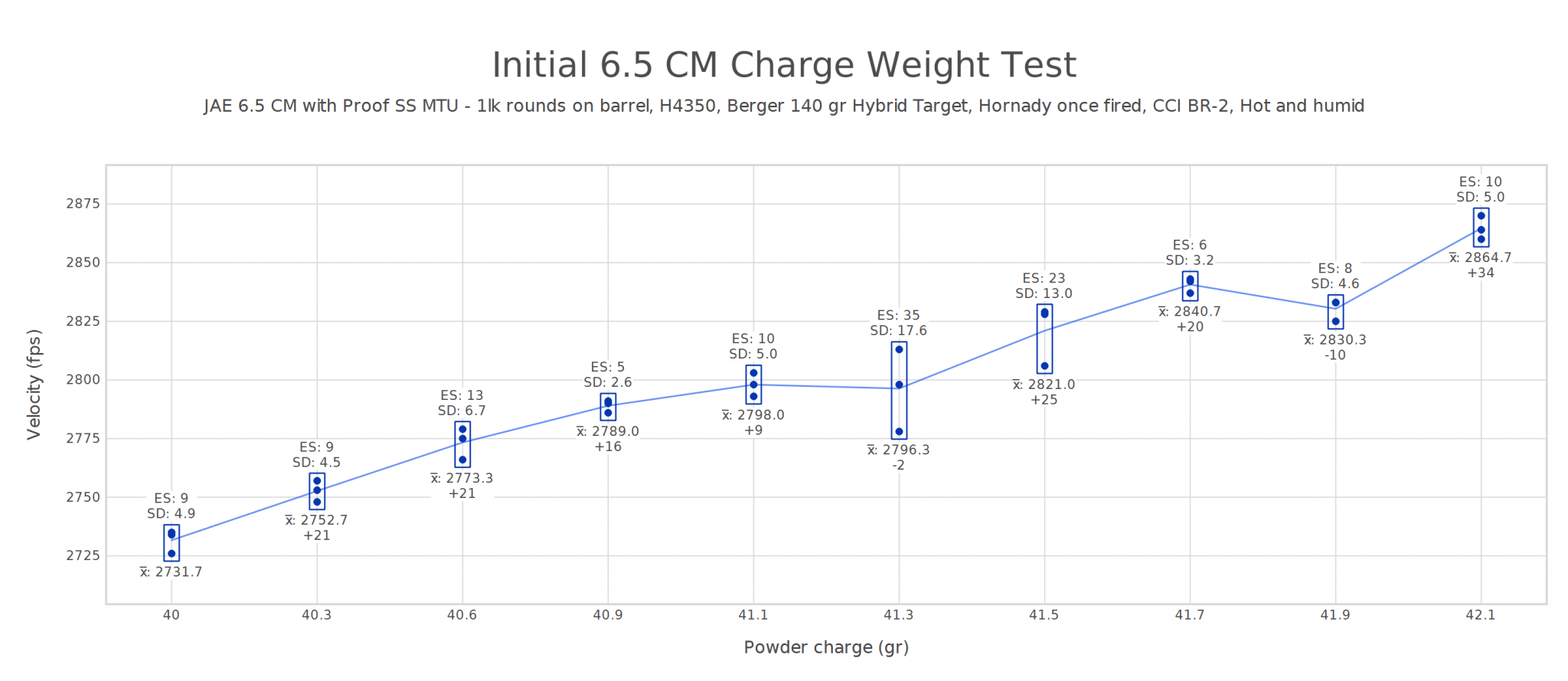And I really love this ChronoPlotter software as it makes it easy to see, for example, that the ES of 41.5 is driven by one of the three shots being slow while the other two are pretty much identical. Also, 41.9 shows AVG MV slowing down in increase in charge, but two of the three shots are identical and the AVG MV was pulled down a tad by the last one.