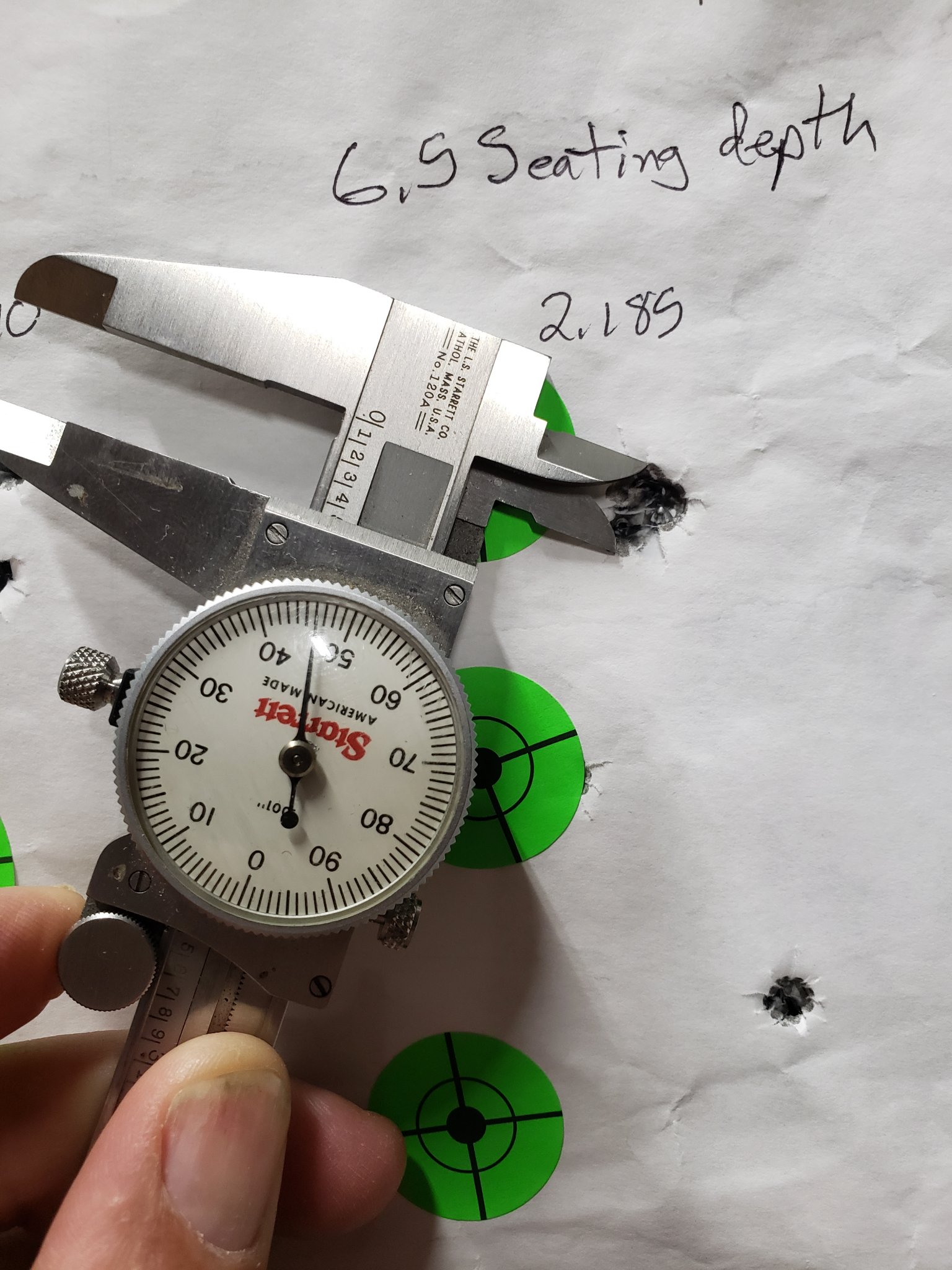 After reading the Precision Rifle Blog, I did a seating test on my new 6.5 Creedmoor barrel with the 140 ELDM. I had a load that shot in the .25" range that was loaded .020" off the lands, so I seated 10 each from .025" to .060" and shot them at 100 yards round robin style, 5 shot groups. The .055" shot the best at .18", but everything was less than .35". I shot 3 of these on steel at 416 yards, but didn't have anything on hand to measure the group with, measured the knife in the picture and it looks to be just under 3/4" center to center. View attachment 7307303View attachment 7307304