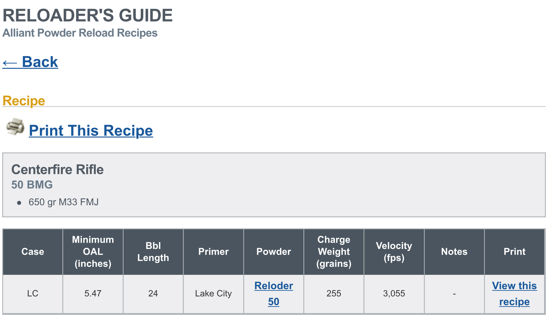Bandit320 Gunny Sergeant Full Member Minuteman Sep 1, 2018 937 3,193 Missouri Feb 7, 2019 #3 Feb 7, 2019 #3 http://www.alliantpowder.com/reload...gtypeid=2&weight=650&shellid=174&bulletid=261 I don’t have a 50 so I can’t speak about this load. Mike Attachments D780D408-08FE-4C04-BDDD-D89B4E6B6F05.jpeg 393.1 KB · Views: 34 Last edited: Feb 7, 2019