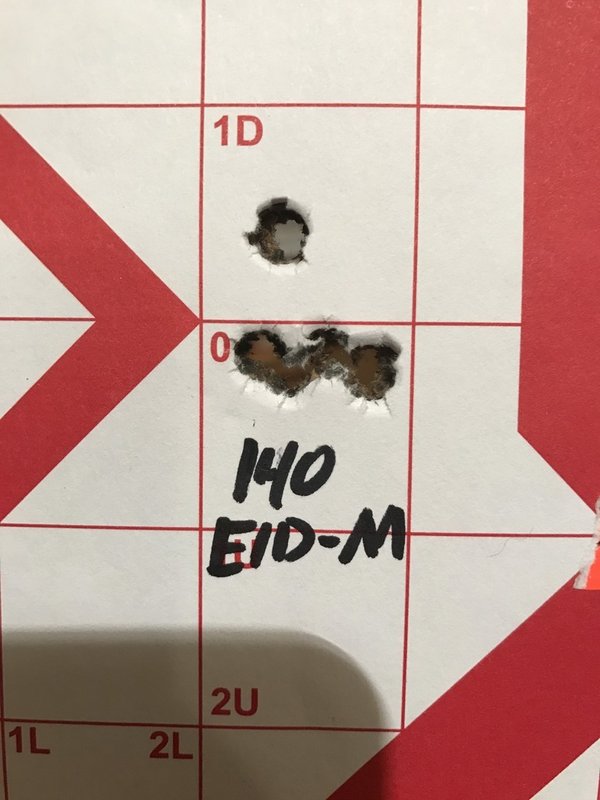 Here is the target from the 140 ELD-M and H4350 load combo. The rounds were shot round robin and the lower right square was one shot from a bullet in the box that was missing it's poly tip. Ejection was perfect @ 4 o'clock about 10-12 ft away. Bolt lock back on last shots all the time. I have had no cycling issues with this combo.