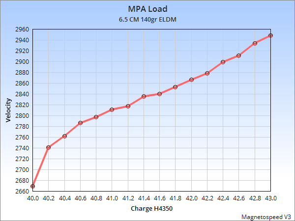 Did a similar test a few days ago, also on a new MPA 6.5 CM, using Lapua 4x fired brass, FL sized, and Berger 140 Hybrids (with a long jump), and my graph looks remarkably similar. Same / similar big jump in speed from 2650 to 2730 fps for only 0.3 gn more powder. Still need to optimize seating depth.