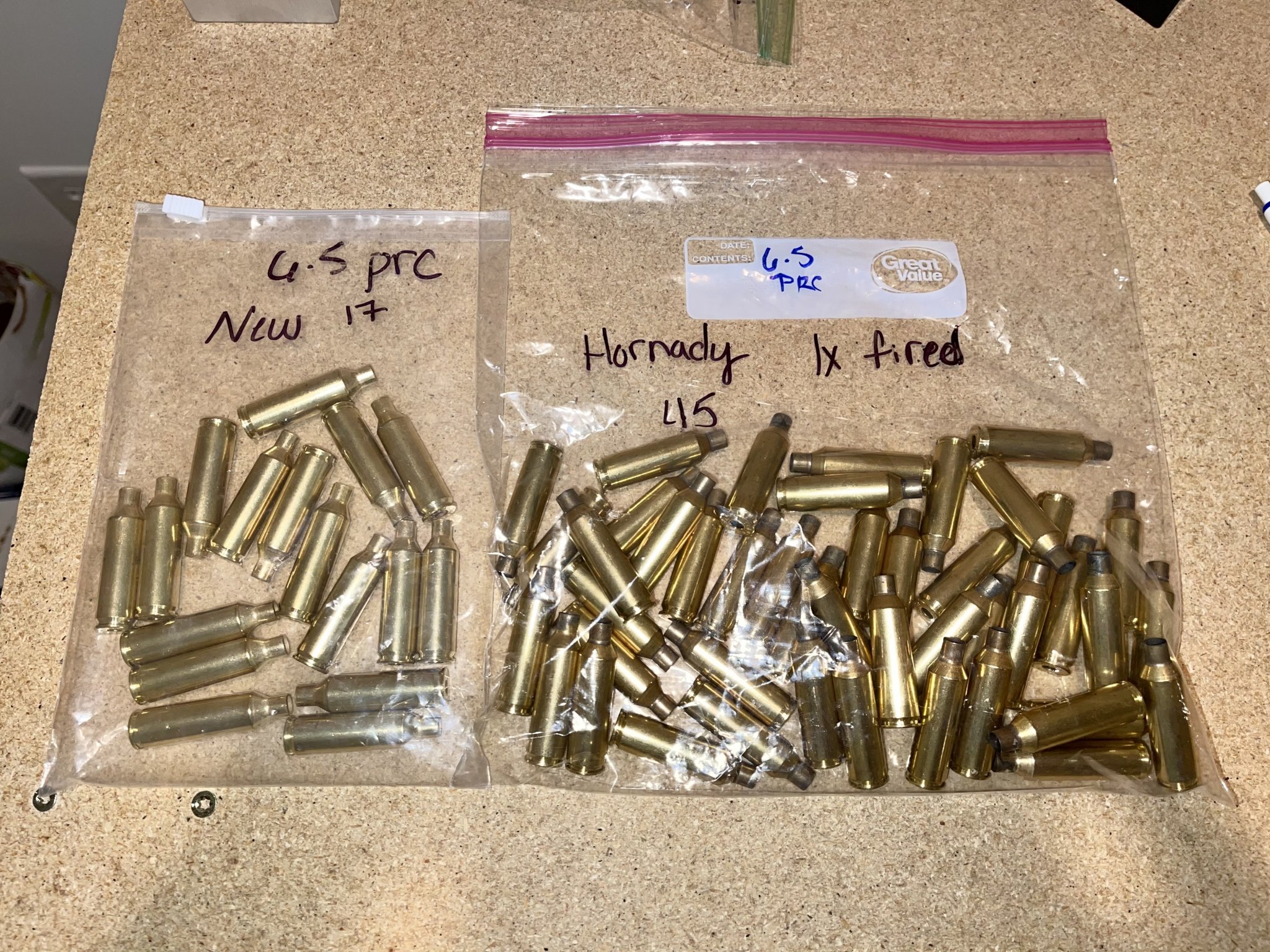-62 pcs of Hornady 6.5 PRC brass (17 new, 45 1x fired) the fired brass has been deprimed but not cleaned or sized $old