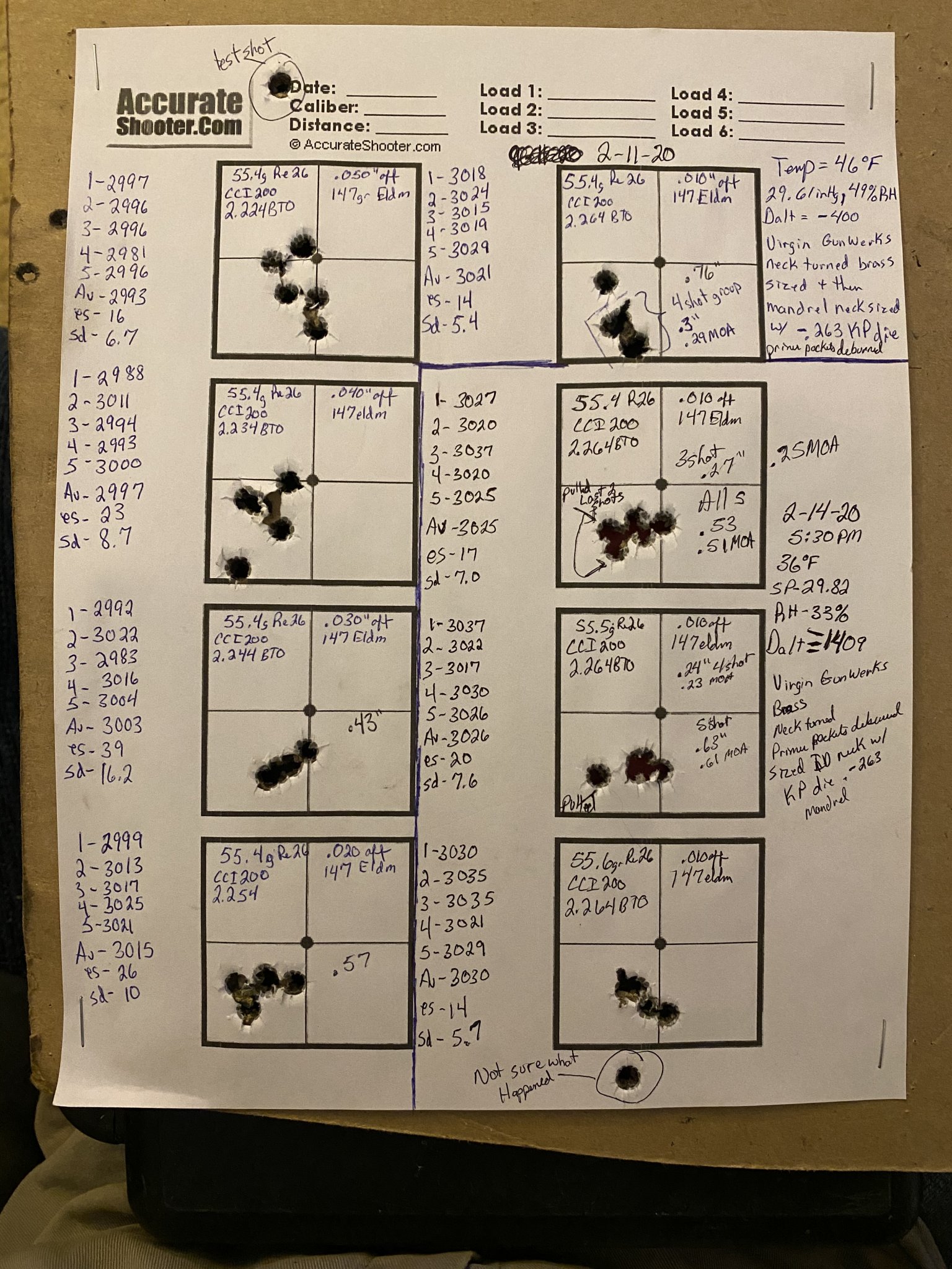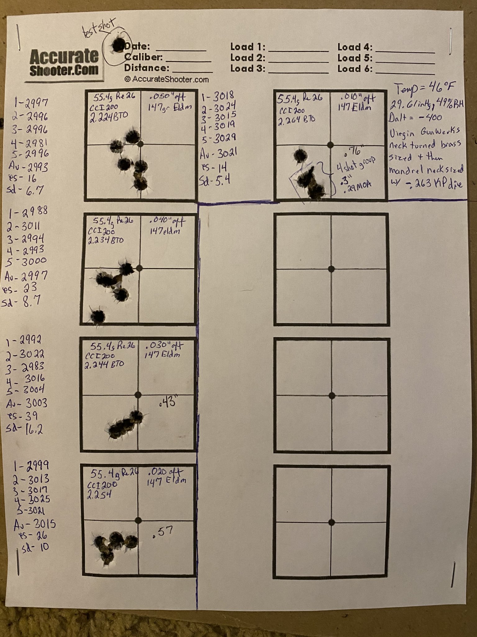 Shot some loads to see if I can find pressure and see what velocity I can get today with Rel26 and IMR8133 all at a CBTO of 2.264 which is .010” off. Rel26 seemed the best between 55.3 at 2990-55.6 at 3016 with virgin Gunwerks brass and cci200 LR primers using a MS V3.