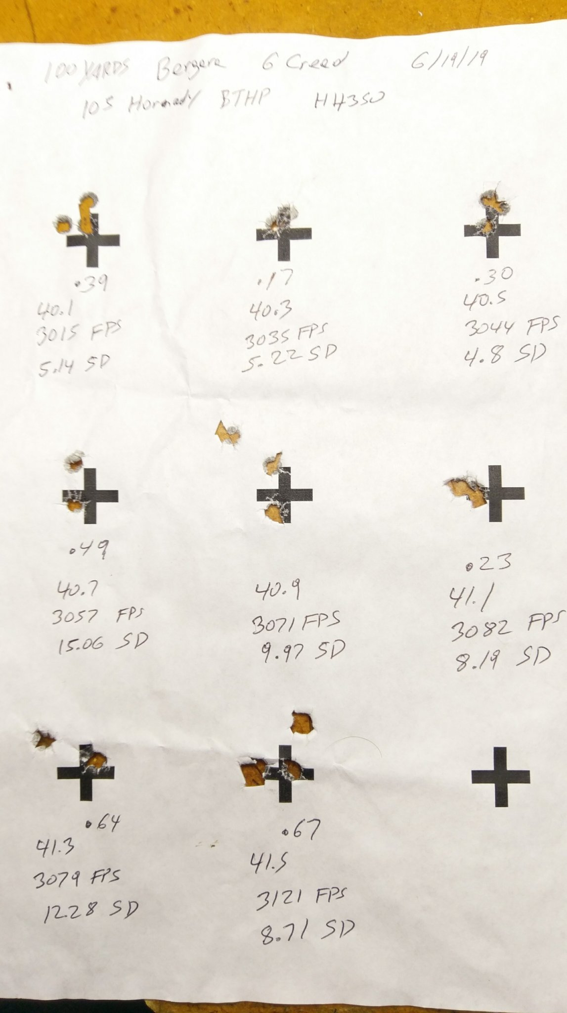 I was surprised at the jump in velocity from 41.3 to 41.5, 42fps from 2 tenths. I know I can go higher but want to keep it below 3100 as 1K is the max I will shoot at and this Bergara craters primers. Some of the later groups opened up a bit but that was me.