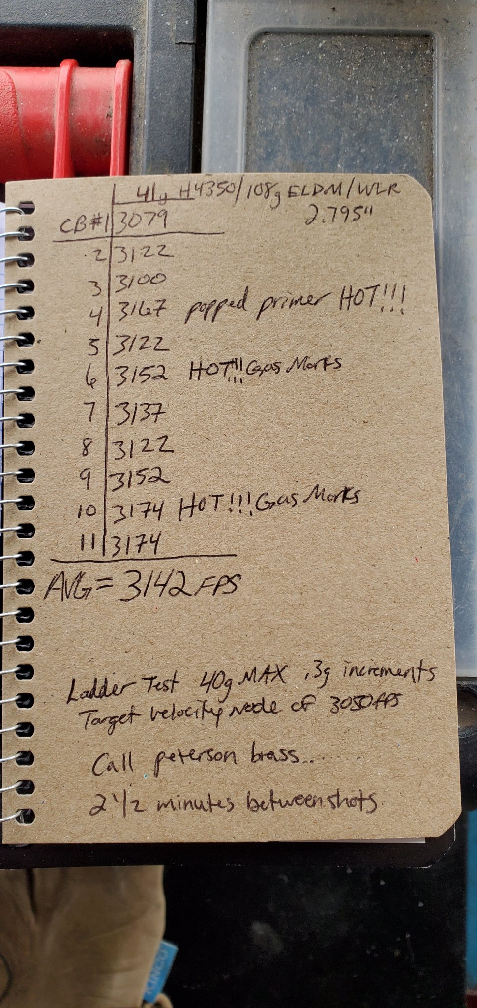 Here's my brass and velocities at 41g H4350 and 108 ELDM...May have figured out the issue is the WLR primers from a few guys on here. If you look at all the other pieces of brass, there's zero issues. Primers look fine, no cratering, no gas marks, no ejector marks, no heavy bolt lift. This was also on a 35 degree day.
