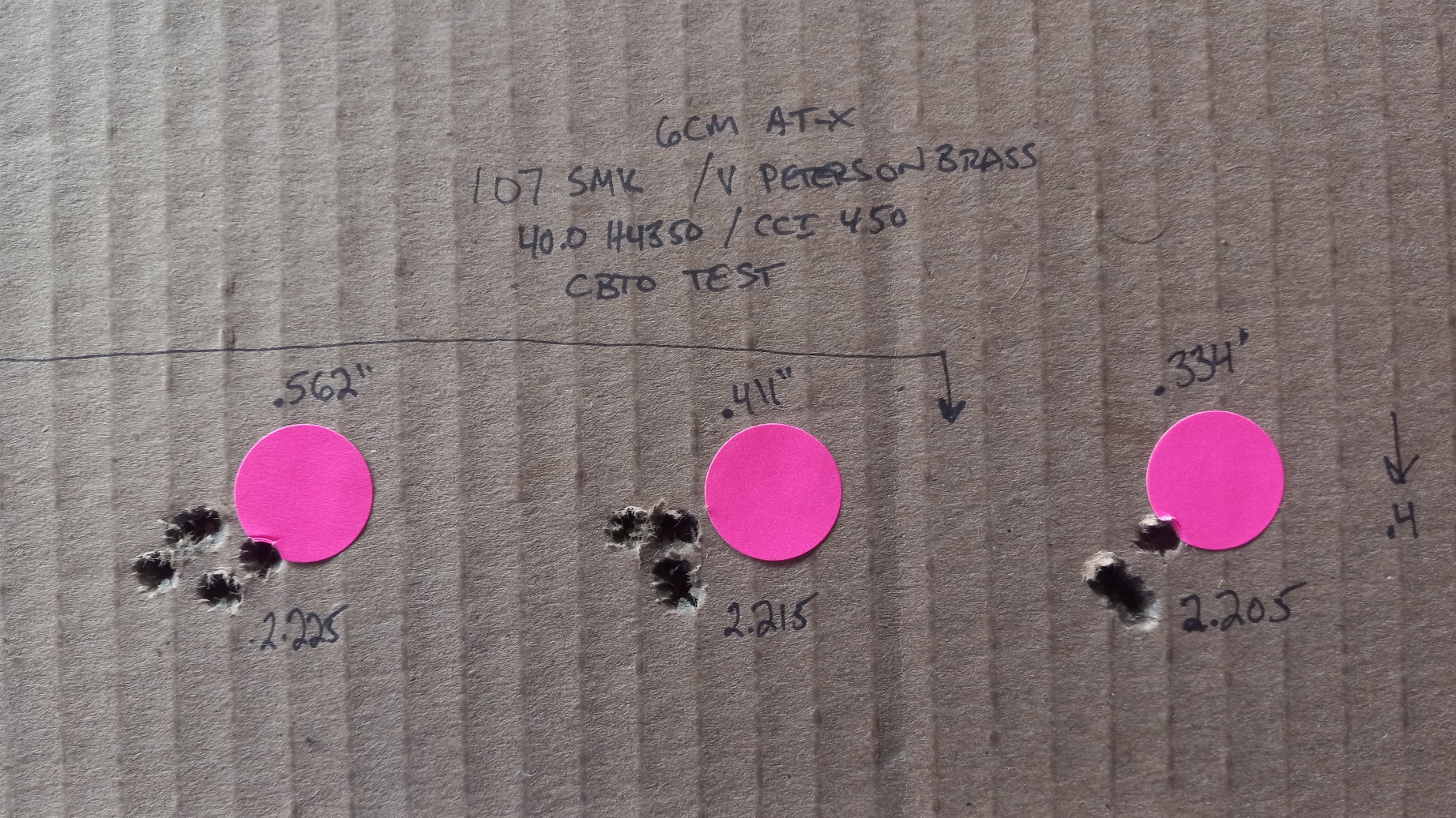Started load development on my new 6CM barrel for my AT-X this afternoon. It had 40 rounds through it before I started, so I expect that it will speed up a bit...but I was pretty disappointed in the velocities.
