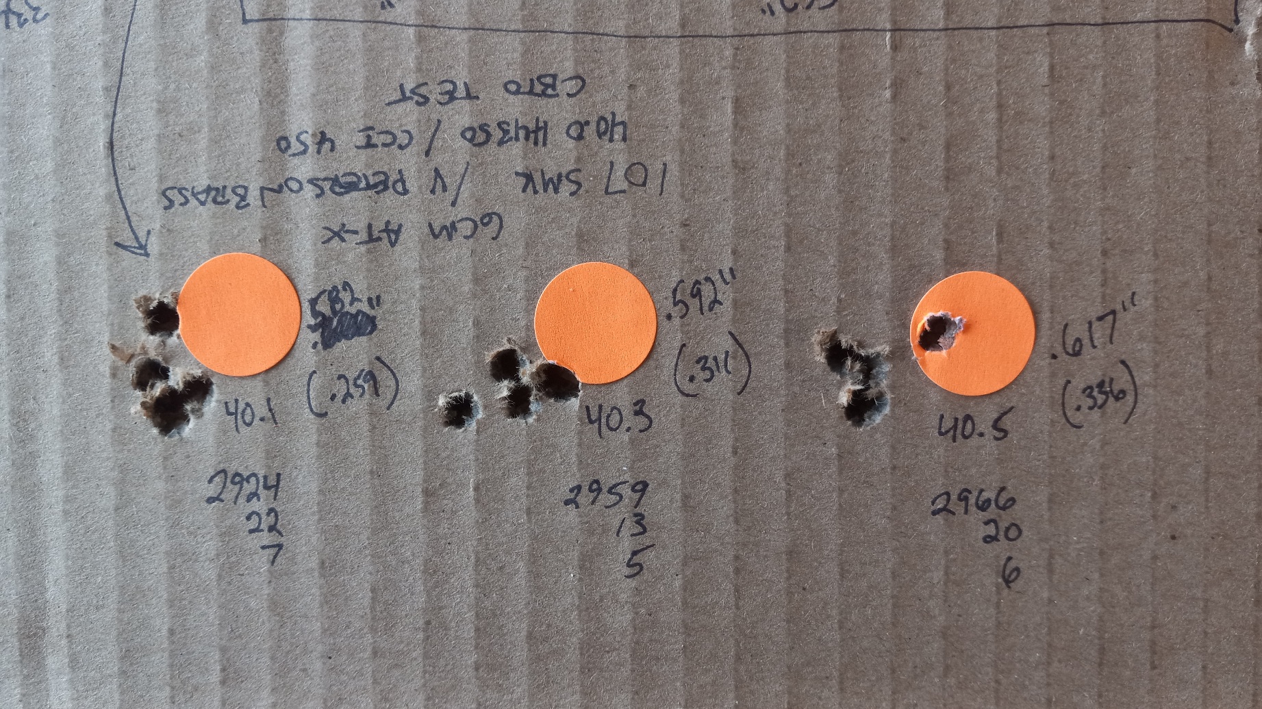 This time it was 39.7, 39.9, and 40.1 - I obviously only went in .2gr increments. Accuracy is everything I could have hoped for, considering that I will allow myself a tenth of an inch or so for wind 😄.
