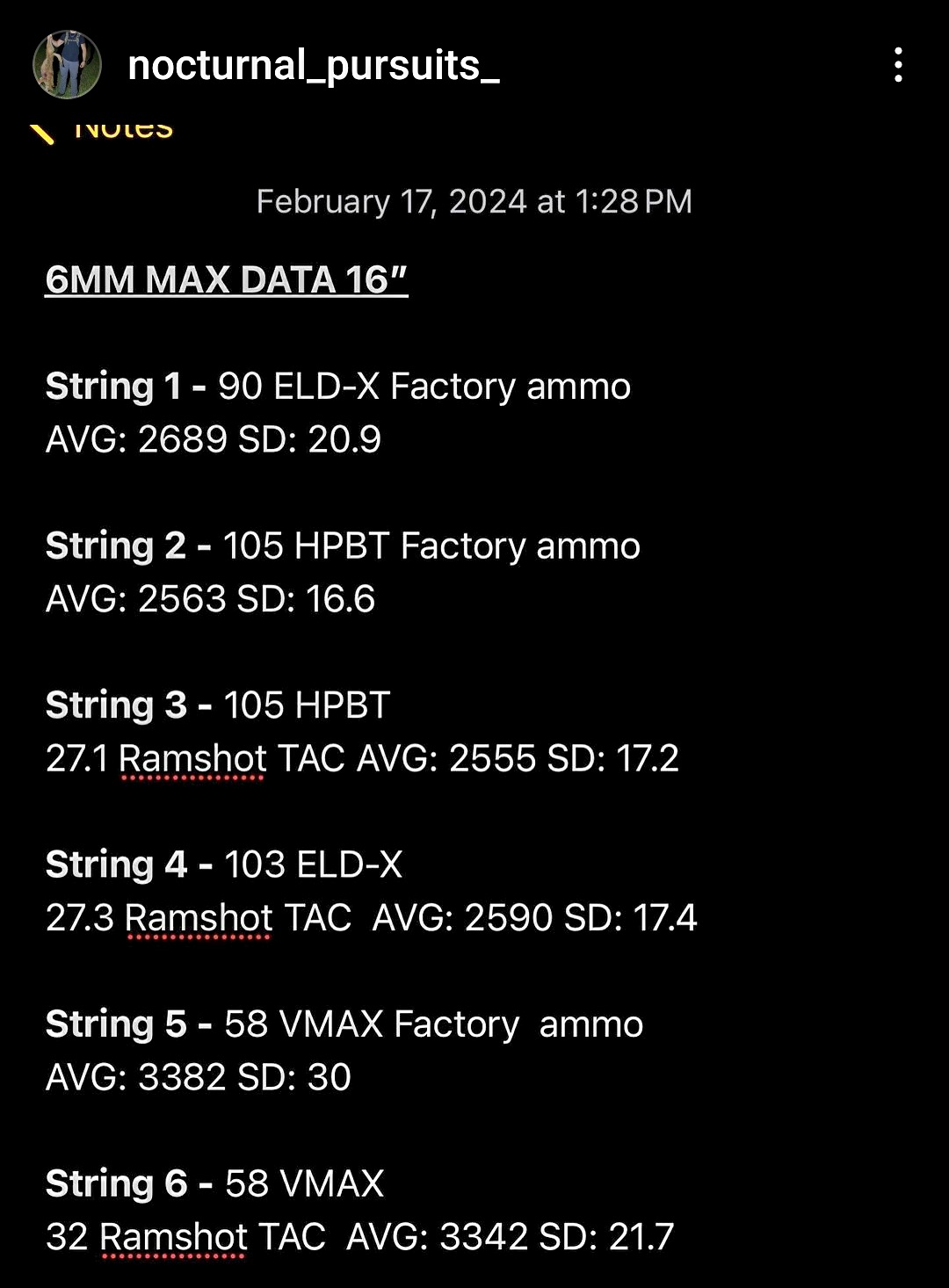 Yeah I've had that thought about the 90s as well.I haven't played with the numbers for a minute, but I'm getting a strong suspicion that the 80-90ish gr might be the sweet spot before the point of diminishing returns for the "high" BC 6mm Max pills for doing work to surpass 77gr SPR work with similar or shorter length barrels.