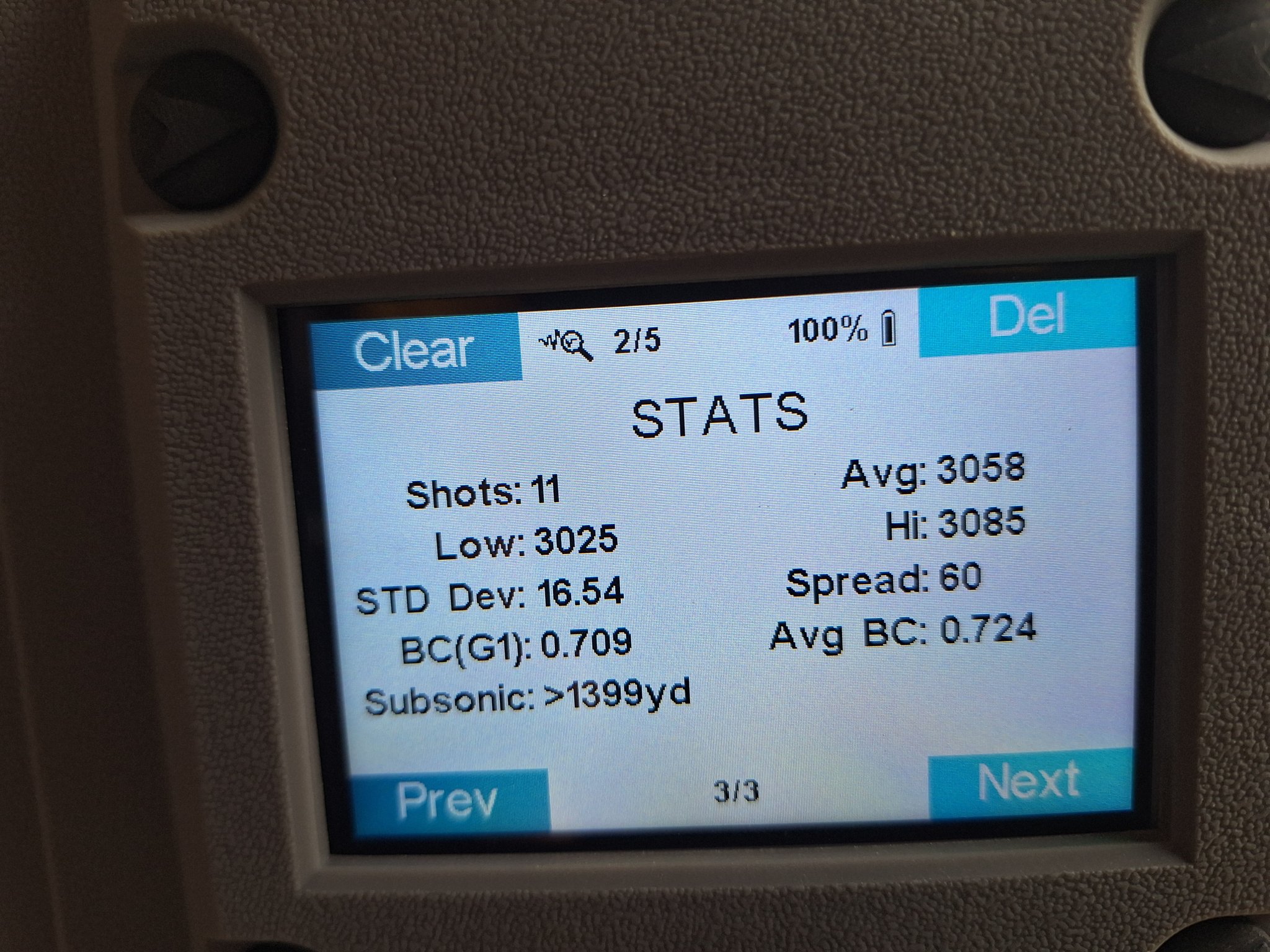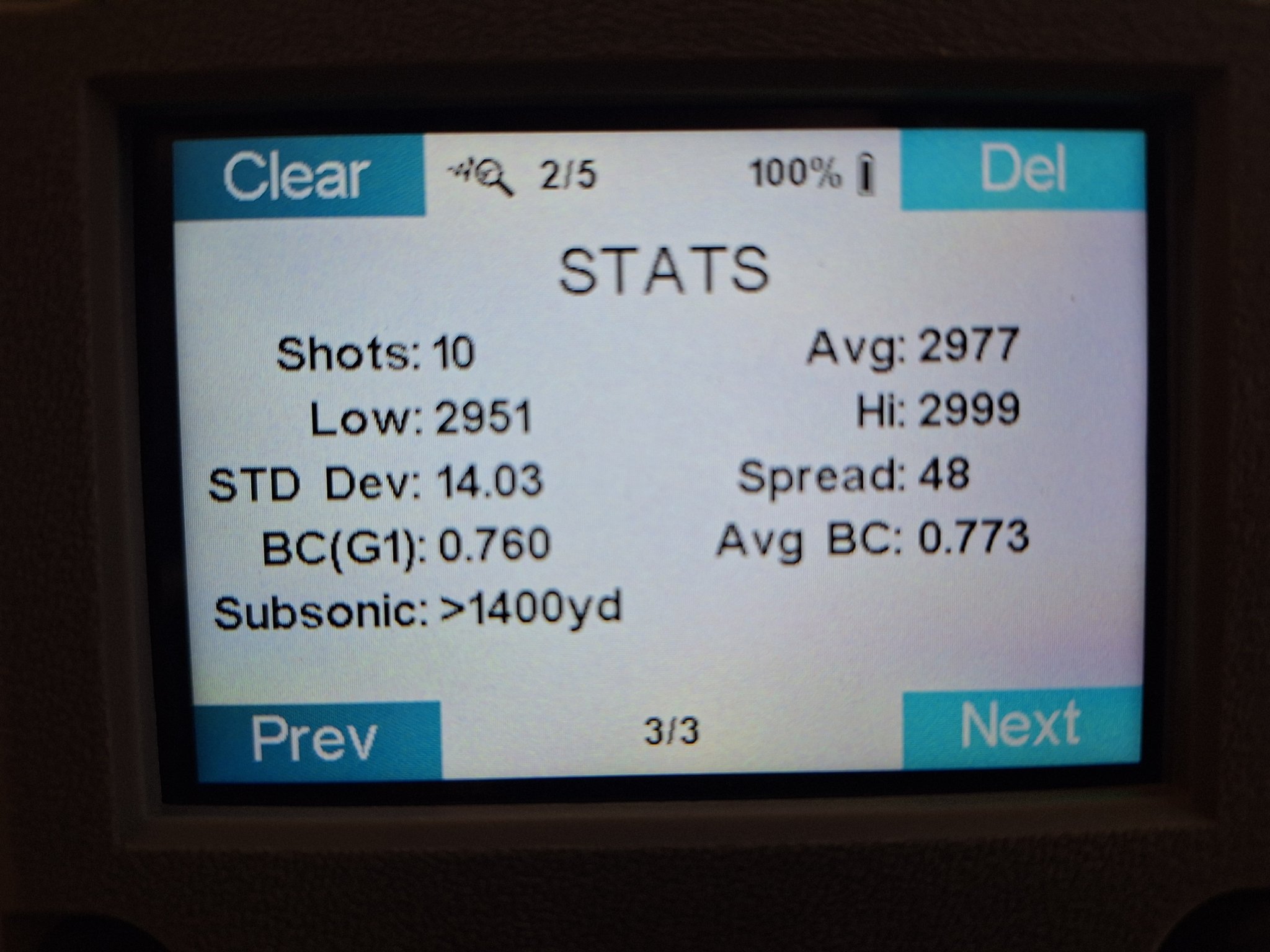 Took my Defiance AnTi-X (pictured above) to the indoor 100 yard tunnel range tonight in SLC. Specs are long action, 24" proof 1-8.4 twist, Leupold 3-15x44 scope XLR Element 4.0 magnesium, Hellfire 3 port brake, Harris bipod, unfired till tonight. Spun up by Eric Smith at ES-Tactical, and he always does phenomenal work. Took 3 rounds to get centered then I fired the following loads in the chart below. I would not pay attention to the SD, there are several reasons I won't elaborate upon, why they are all over the place (part of it is the tunnel itself messes with the radar). Also, the first group of 4 was right at 0.5", one ragged hole. They deteriorated after that, I thought it was me getting my cage rattled in the tunnel, then I realized I never torqued down the side bolts to the rings beyond finger tight! And the scope was loose, and my crescent wrench was missing from my range bag, so I called it quits after that discovery. Anyway, I'm posting this data for velocity and pressure information. Only the last one of the 69.0 grains of H1000 in Hornady brass had just slight increase bolt lift, and an ejector mark. I usually back down from that a grain, so I think I'm going to settle on 68 grains. (QL thinks 68 grains is 106.7% full [not even close!], gets 62342 PSI, and produces 2886 fps - so close to my results and almost max velocity/pressure on QL, FWIW.) All cci 250 (as if that matters). COAL is 3.310, which is .025" off the lands. The 69 grain one is 99+% full - I can barely hear it rattle and there is no crunch. QL thinks this should be 108% full for some reason that is beyond me - this is not a compressed load AT ALL. The case capacity is just shy of 82.0 grains H20. Ambient temperature was about 65 degrees in the tunnel, but the ammo started at about 40 degrees and I warmed the rounds up (a little) in my pocket before firing. Powder humidity was 48.5%RH at the time of reloading and at 60 degrees F. Also, I never shot more than 3 rounds before cooling the barrel with my Ryobi inflator gizmo - this is my first time with a Proof and they do indeed heat up and require some real air movement or time to cool off!