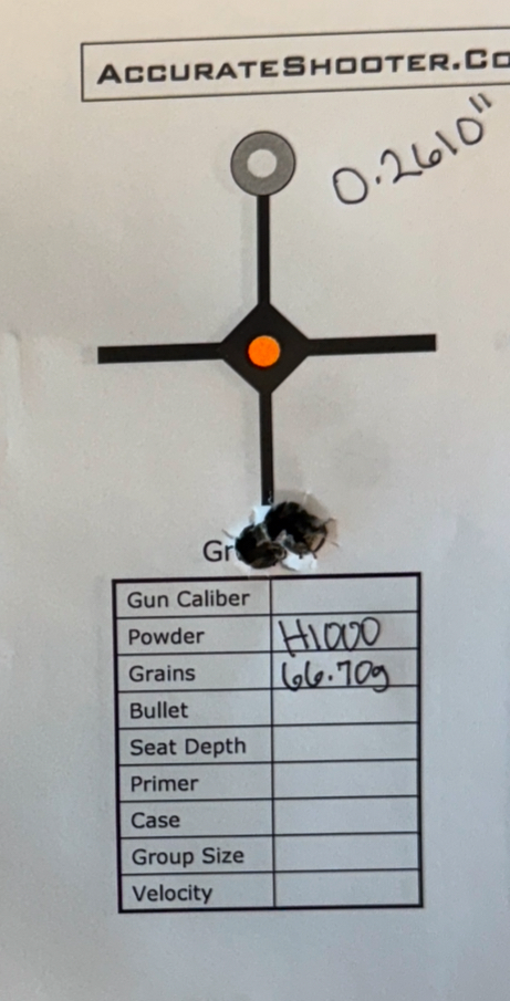 I find something that shows promise. If it shows good ES/SD with acceptable accuracy .5” or better, then I load up another three shoot paper again, and what I’m looking for is consistent ES/SD, similar group size or better, and same point of aim/same point of impact. If the second group repeats, then I load up 6 more retest everything I said above, & if it checks out okay I’ll then test at distance.